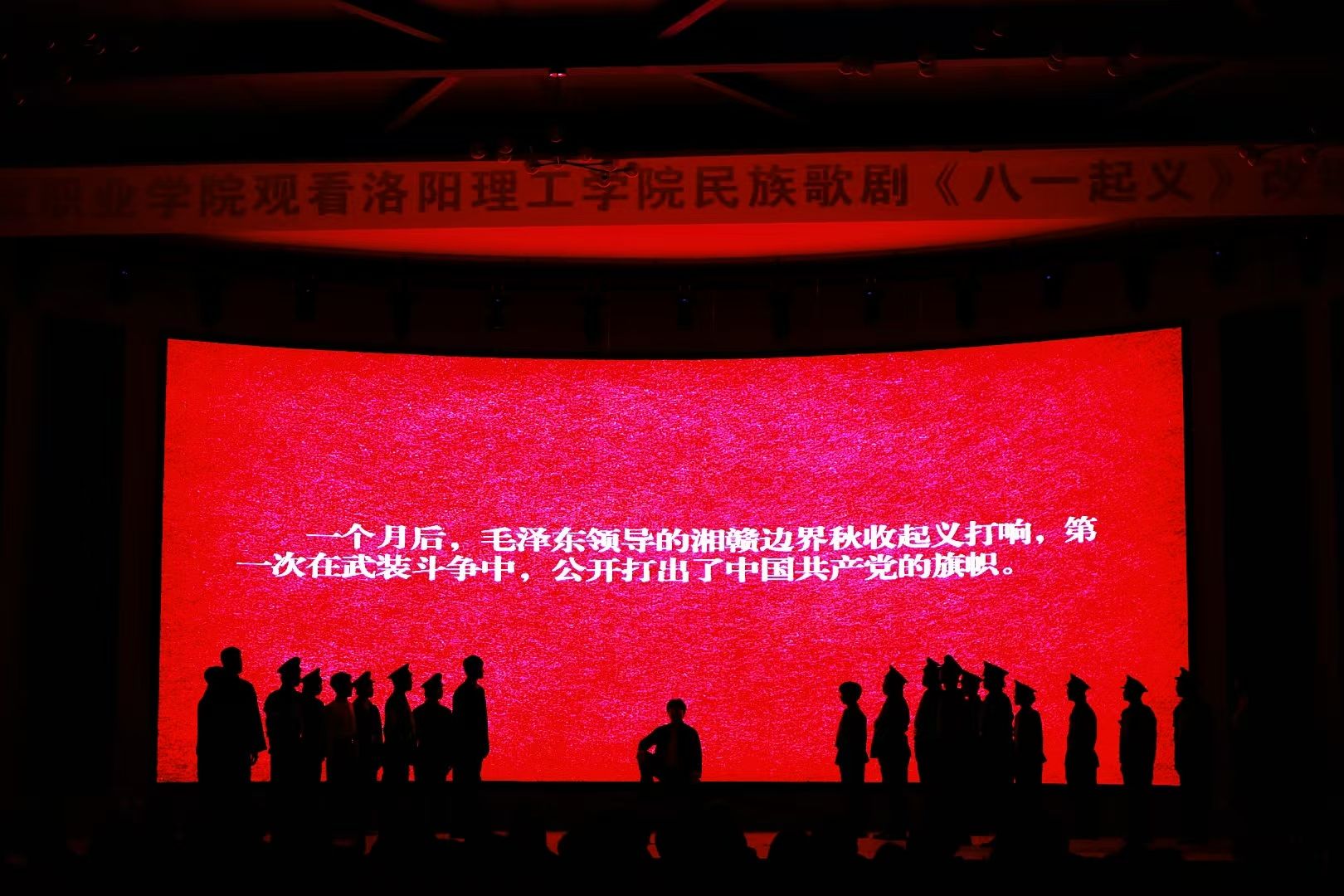 2024年12月2日,我院邱俊智博士歌剧剧组班演出的思政歌剧《八一起义》(本剧改编自江西省歌舞剧院原创民族歌剧《八一起义》)在河南物流职业学院精彩上演。河南物流职业技术学院校党委书记朱红恒、校纪委书记张晖、河南物流职业技术学院相关部门负责人、马克思主义学院全体教师及各班级、各社团学生代表共计500余人出席并观看了演出。演出过程中,观看演出的师生被演员们精湛的演艺深深吸引和感染,现场不时爆发出热烈的掌声。这次演出,既让同学们深受艺术感染,又让红色基因在同学们心中生根发芽,是推进新时代思政教育创新的有益尝试。演出取得了圆满成功。