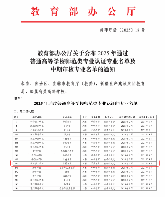 近日,教育部办公厅印发《关于公布2025年通过普通高等学校师范类专业认证专业名单及中期审核专业名单的通知》(教师厅函〔2025〕18号),我院学前教育专业顺利通过师范类专业第二级认证,认证有效期为6年(有条件),具体时间为2025年9月至2031年8月。这是洛阳理工学院首个通过普通高等学校师范类专业认证的文科类专业,标志着我校在专业建设方面取得又一重要突破。