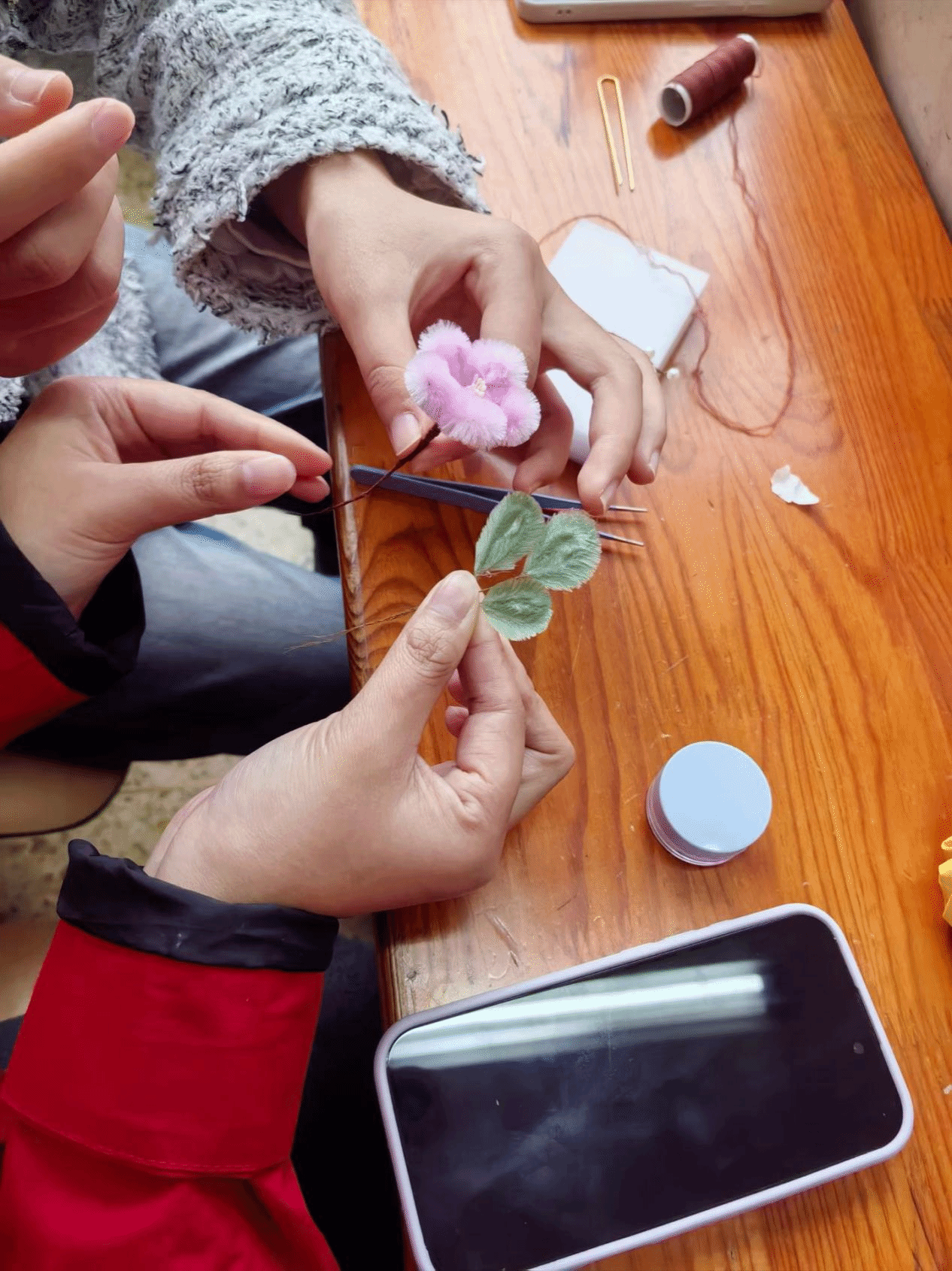 课堂上,郑雅妹老师以深厚的行业积淀和生动的讲解,从绒花的历史渊源、文化寓意切入,系统梳理了这门非遗技艺的发展脉络,同时结合当下市场现状,深入分析了绒花产业的创新方向与应用前景,为学生们搭建起“传统技艺+现代应用”的认知桥梁。理论分享后,郑老师手把手指导学生体验绒花制作流程,从绒线梳理、绕丝成型到修剪塑形,每一个步骤都细致示范、耐心答疑。