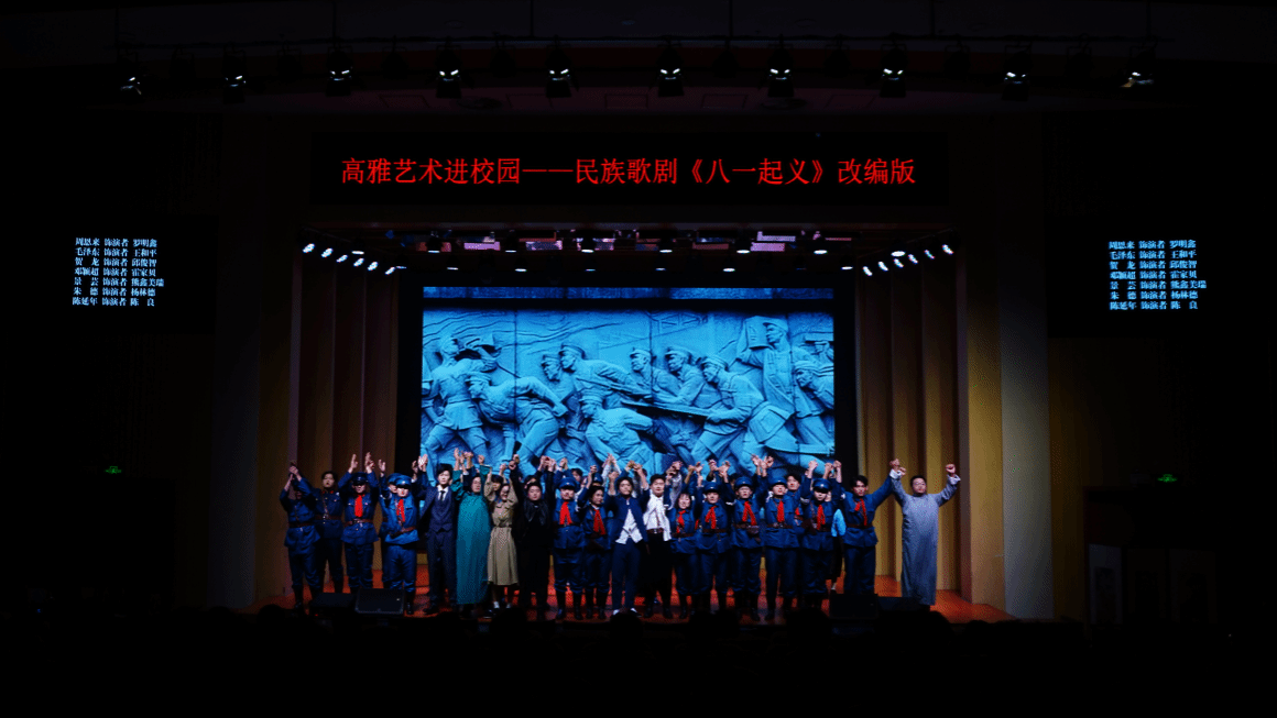2025年11月6日晚,由公共艺术教育中心联合我院邱俊智歌剧社精心打造、倾情演绎的民族歌剧《八一起义》邱俊智歌剧社改编版在王城校区图书馆报告厅隆重上演。作为学校深化课程思政建设的重要实践项目,这场演出以艺术为载体,将红色基因融入专业教学,为师生带来一堂鲜活生动的“沉浸式思政课”。