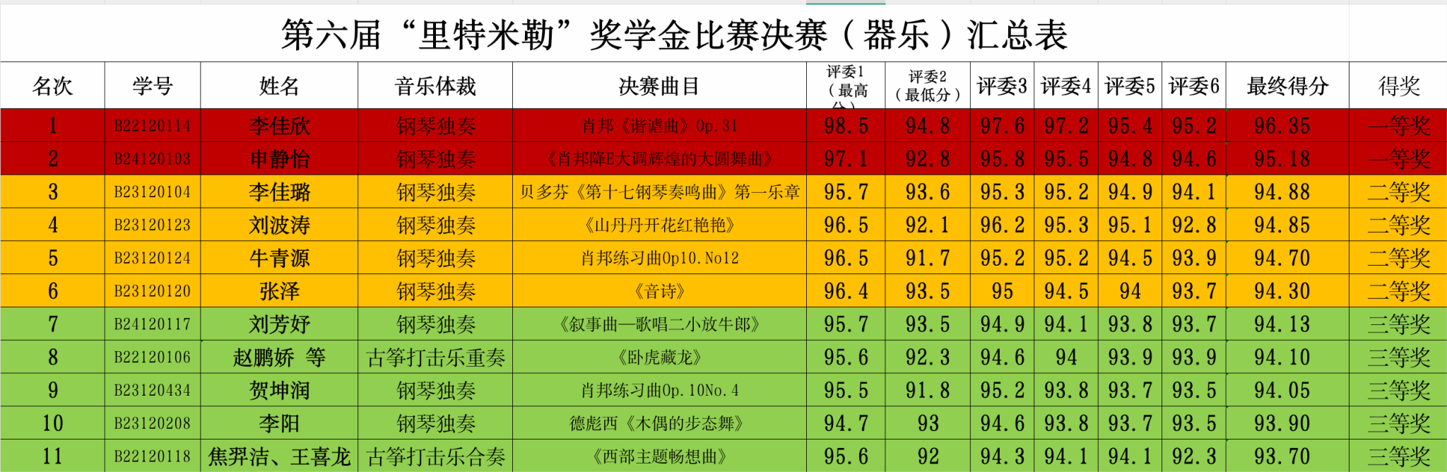 经评审,最终评选出一等奖4名、二等奖8名、三等奖10名(后附获奖名单)。此次比赛不仅为学生提供了展示才华的平台,也进一步激发了学生的学习热情与艺术创造力。 “里特米勒奖学金”的设立与比赛的开展,是校企合作共同推动艺术教育的重要举措。学院将继续深化与珠江钢琴集团的合作,不断拓展音乐教育及艺术实践的广度与深度,助力学生成长成才。