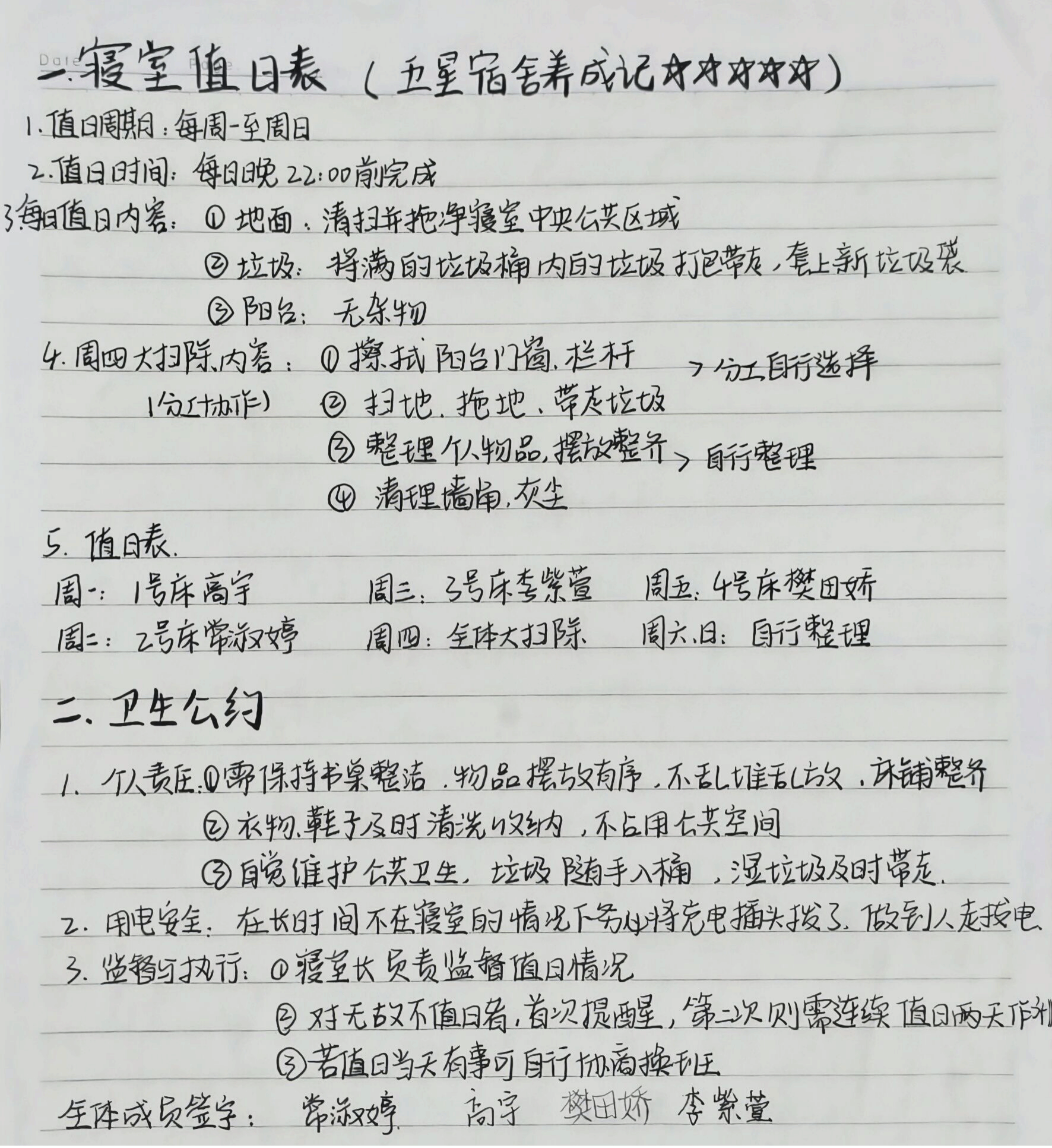 随着实践深入,各寝室共同研讨制定精细化值日表与卫生公约,明确轮值职责、维护标准与监督机制。从每日地面清扫、垃圾处理到周四全面保洁,从个人书桌整理、衣物收纳到用电安全规范,每一项细则都彰显着契约精神与集体责任。这张小小的值日表,让整洁有序从“一时之功”转化为 “常态之美”,让劳动习惯内化为生活素养,更让集体荣誉感在共建共享中生根发芽。