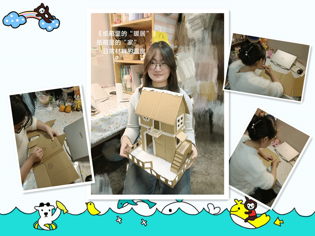 秋日里,同学们以银杏叶为材制作精美礼帽,在剪裁粘贴中领悟“细致与坚持方能成就美好”,让自然之美在劳动中绽放;同学们还巧用废旧纸箱还原理想“暖居”,从“手忙脚乱”到“渐入佳境”,践行“环保不是口号,是动手创造”的理念,让低碳生活在劳动中落地;同学更是自制环保布艺书皮,在测量、缝合、解决实操难题的过程中,既破解了塑料书皮不环保、缺个性的痛点,更体会到手工制作的独特温度与创新思考的乐趣,让实用与美学在劳动中统一。