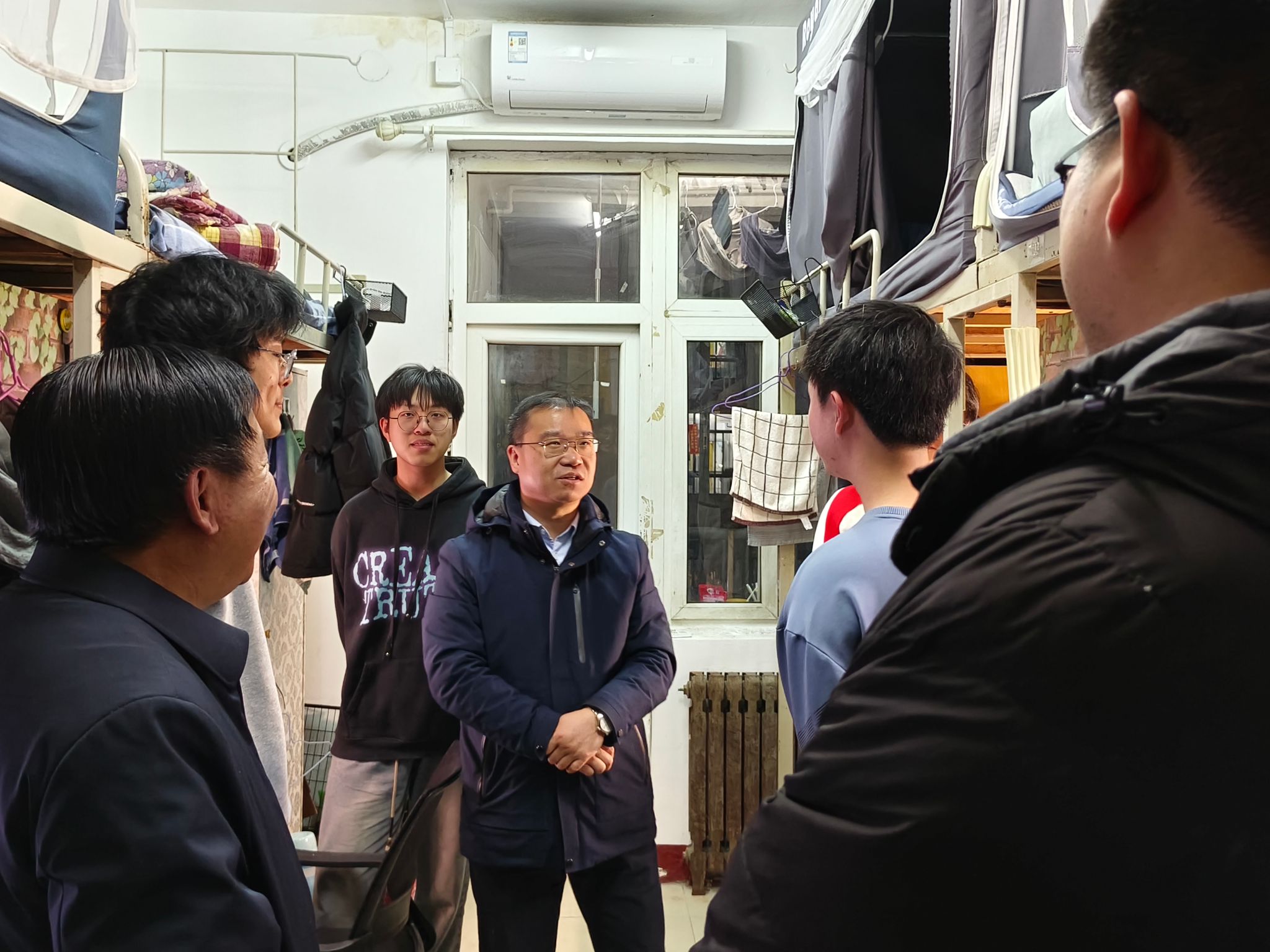 走访过程中,学院领导与辅导员分组行动,覆盖全院各年级宿舍。党委书记曹相智关切询问学生寒假社会实践、家乡见闻及返校适应情况,鼓励学生“收心归位”,做好学业规划。同时,他详细了解毕业班学生的就业去向、未来规划,询问毕业生当前遇到的困难和问题。院长马腾详细询问学生课程学习情况,鼓励学生规划好新学期学业安排,以饱满热情开启新的篇章,并结合专业发展动态,针对高年级学生考研、就业等问题给予个性化建议,辅导员逐一核对学生返校信息,记录学生实际需求,强调寝室消防安全的重要性,耐心提醒同学们要时刻保持警惕,力求将反诈骗的意识深深植根于每一位同学的心中,让防诈知识真正走进每一间寝室。同时也针对春季宿舍安全重点,对宿舍用电规范、消防设施、卫生环境等进行全面排查。现场抽查插座使用情况,提醒学生杜绝违规电器,并强调“安全无小事,防患于未然”。
