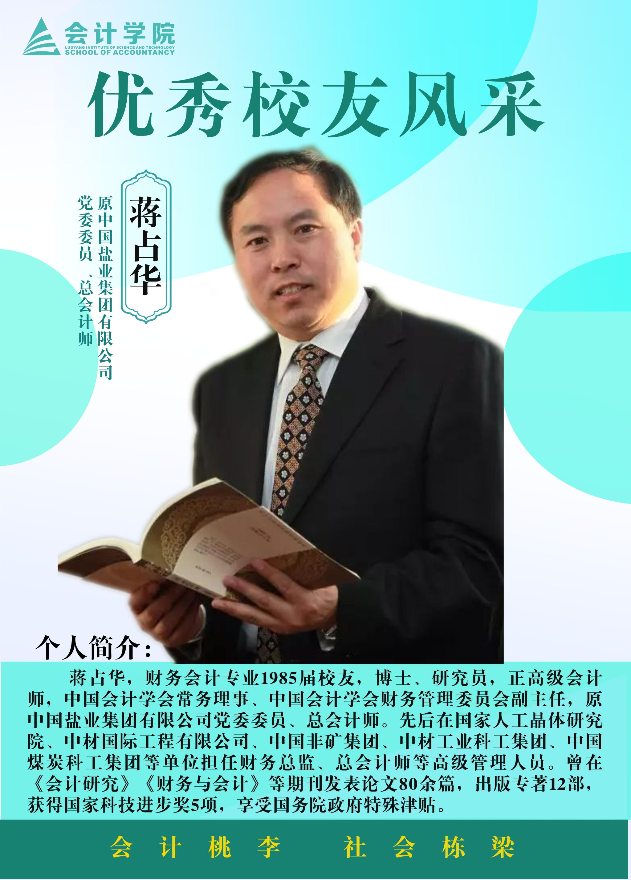 蒋占华,财务会计专业1985届校友,博士、研究员,正高级会计师,中国会计学会常务理事、中国会计学会财务管理委员会副主任,原中国盐业集团有限公司党委委员、总会计师。先后在国家人工晶体研究院、中材国际工程有限公司、中国非矿集团、中材工业科工集团、中国煤炭科工集团等单位担任财务总监、总会计师等高级管理人员。曾在《会计研究》《财务与会计》等期刊发表论文80余篇,出版专著12部,获得国家科技进步奖5项,享受国务院政府特殊津贴。