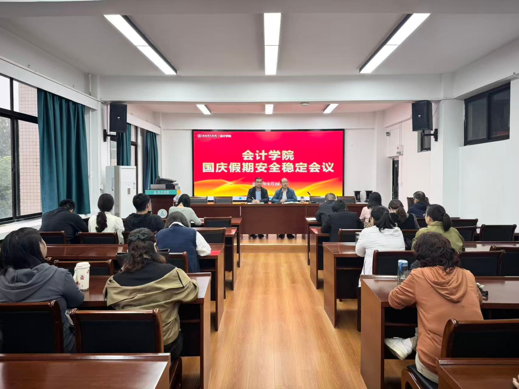 为切实保障国庆假期期间师生人身财产安全,筑牢校园安全防线,9月28日,会计学院召开国庆假期安全稳定会议。学院全体教职工参加,院长马腾主持会议,党委书记曹相智做重点工作安排。