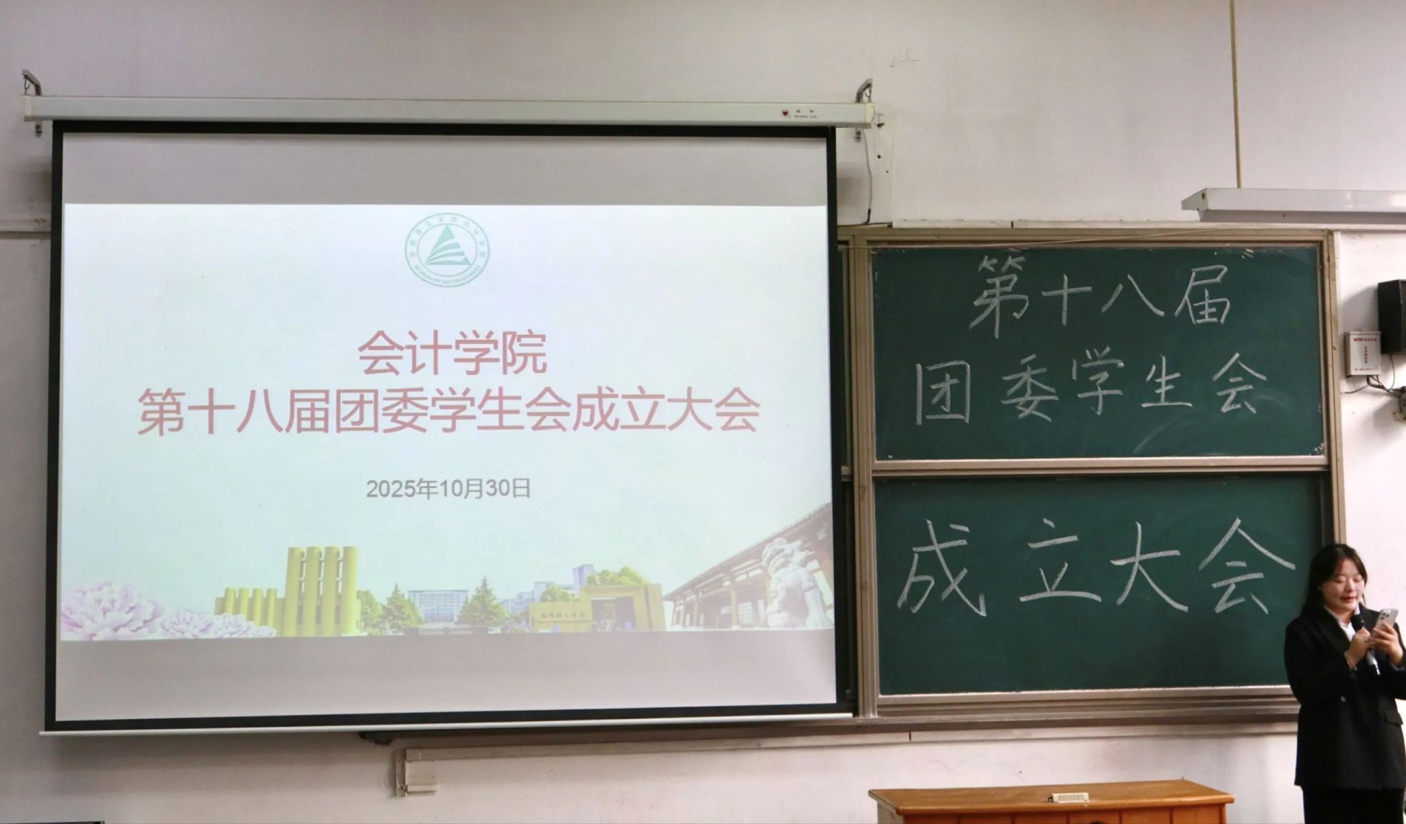为增强会计学院团委学生会凝聚力、引导新成员主动担当作为,洛阳理工学院会计学院于10月30日在教学楼D1召开第十八届团委学生会成立大会。学院党委副书记郭春林、学工办主任李雷喆、团委副书记温跃卫,就业指导办公室副主任郭瑞行,辅导员周玉姣及新一届团委学生会干部出席大会。