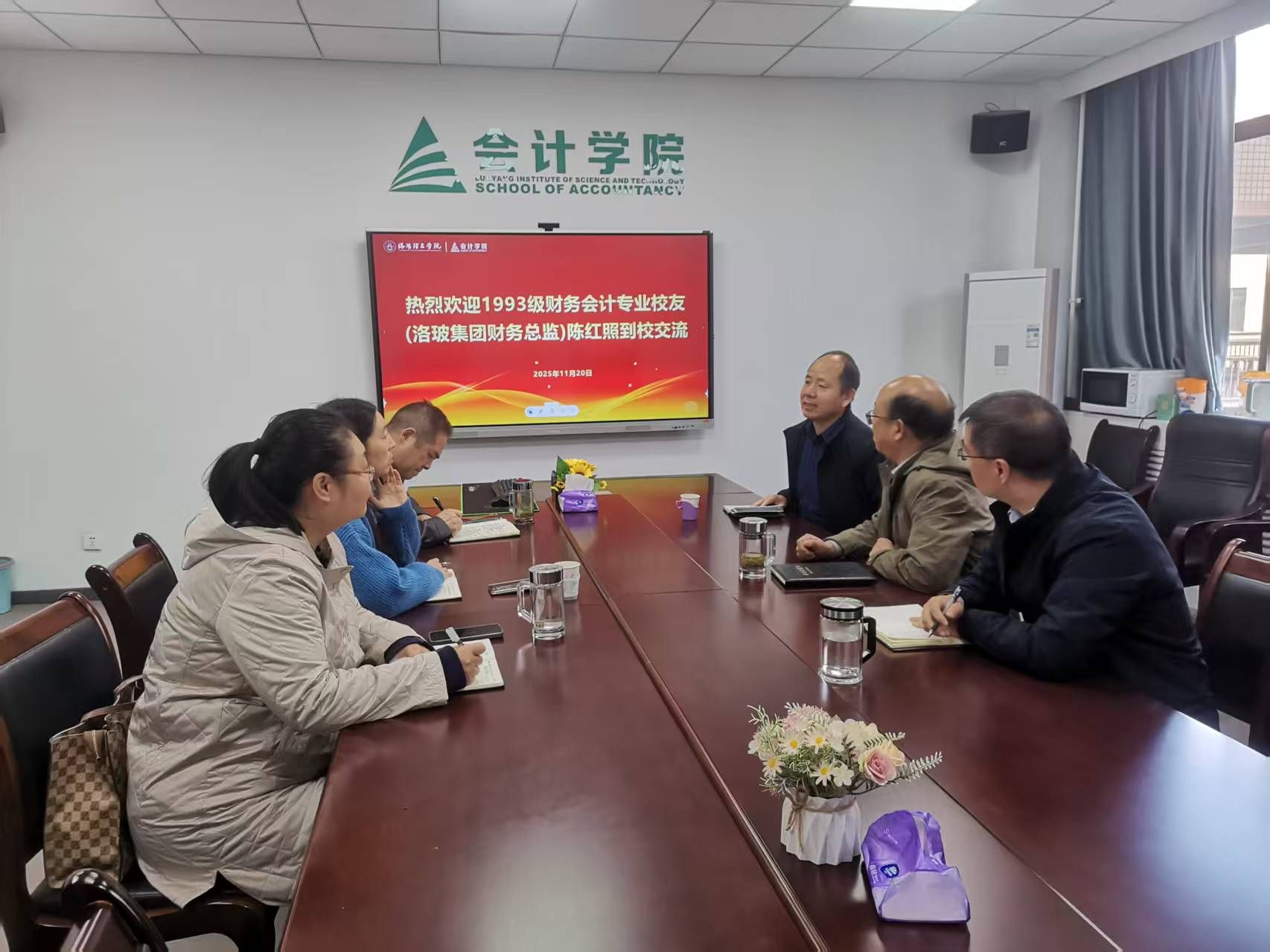 近日,洛阳理工学院会计学院特邀1993级财务会计专业优秀校友、现任洛玻集团财务总监陈红照返校,举办专场交流分享会。学院党委书记曹相智、院长马腾、副院长蔡洁、副院长张国柱,会计学系主任张莉、审计与信息化系主任刘蔚等出席交流会,与会人员共同聆听校友分享,共探会计行业前沿趋势与人才培养之道。