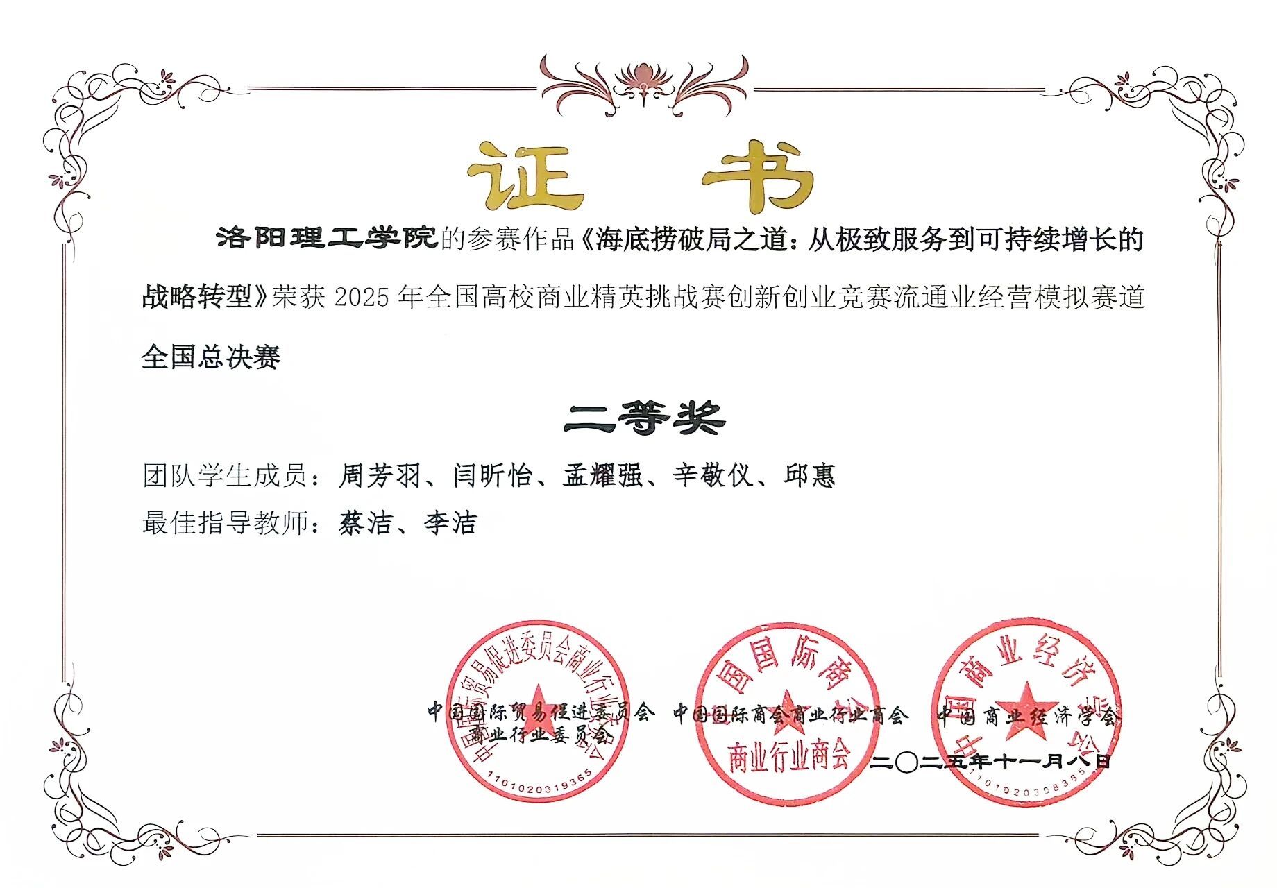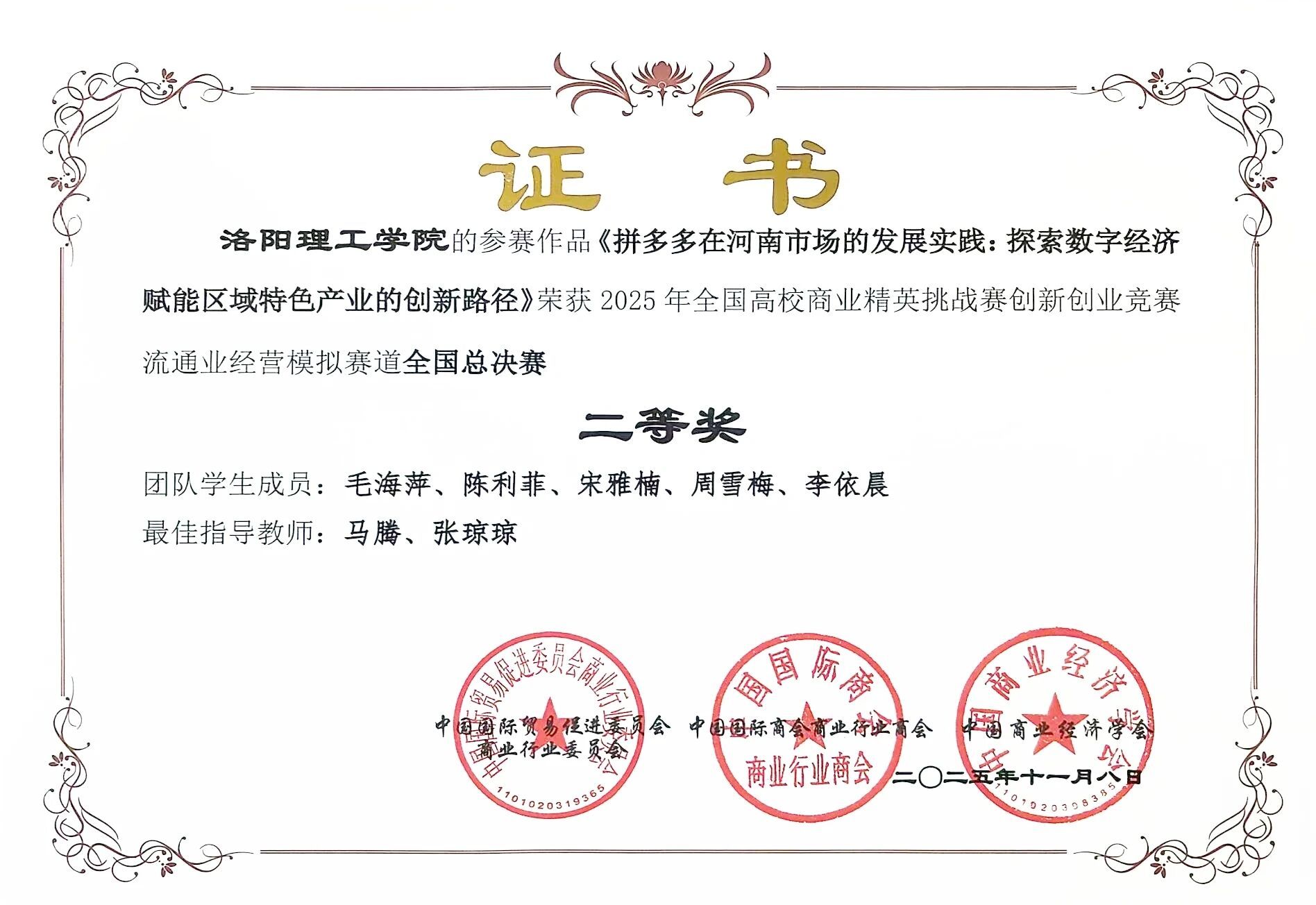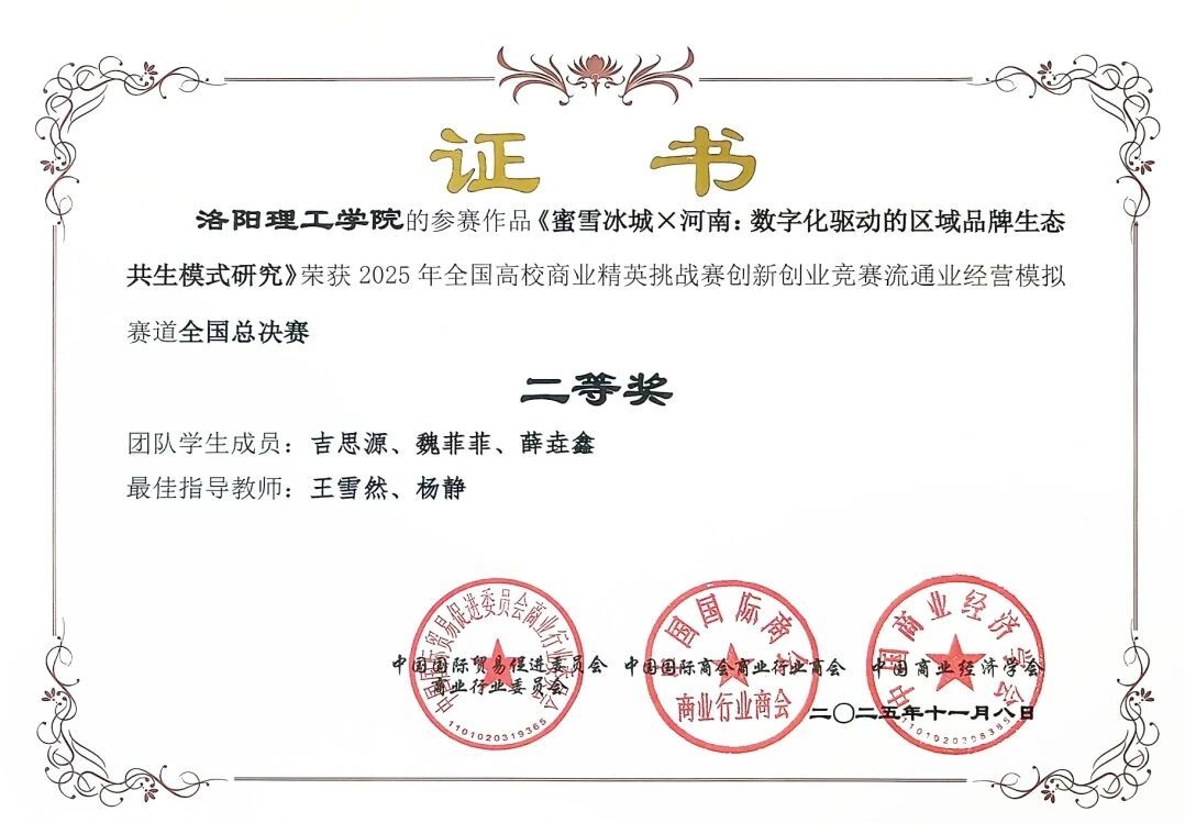 11月8日,全国高校商业精英挑战赛创新创业竞赛流通业经营模拟赛道全国总决赛圆满结束。洛阳理工学院会计学院选派四支代表队参赛,历经区域选拔赛及全国总决赛的多轮竞争,在马腾、蔡洁、温跃卫、王雪然、杨静、李洁、张琼琼、郭盼婷八位教师的全程系统指导下,四支队伍最终均荣获全国总决赛二等奖。
