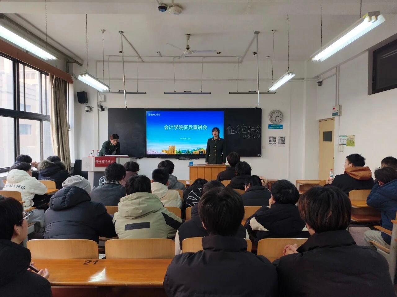 为积极响应国家征兵号召,帮助青年学子深入了解征兵政策、明确入伍流程、规划军旅发展,2025年12月30日下午,会计学院在XD110教室成功举办征兵宣讲会。本次宣讲会由会计学院征兵联络员郭瑞行主持,特邀学校戎耀征兵宣讲团成员李汶倩、杨永康担任主讲,学院各年级学生代表踊跃参与。