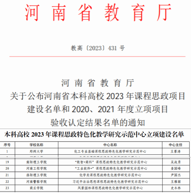 近日,经学校申报、专家评审、现场答辩、结果公示等环节,河南省教育厅公布了《本科高校学院2023学院年课程思政特色化教学研究示范中心立项建设名单》,学院尹国杰副院长团队申报的“化学类课程思政特色化教学研究示范中心”成功入围。