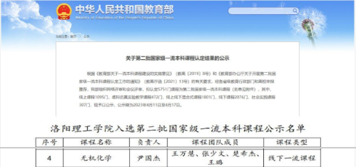 近日,学院《无机化学》课程入选国家级一流课程,该课程团队在尹国杰副院长带领下,团队成员精诚合作,艰苦拼搏,终于获得重大成果。国家级一流课程的入选,对学院后续一流课程的持续建设起到了示范引领作用,也为学院更多课程建设起到了一定的推动和启发作用,学院教师今后将不断努力,持续为学生提供更多更高质量的课程资源,也将为学院的发展做出更高质量成果。
