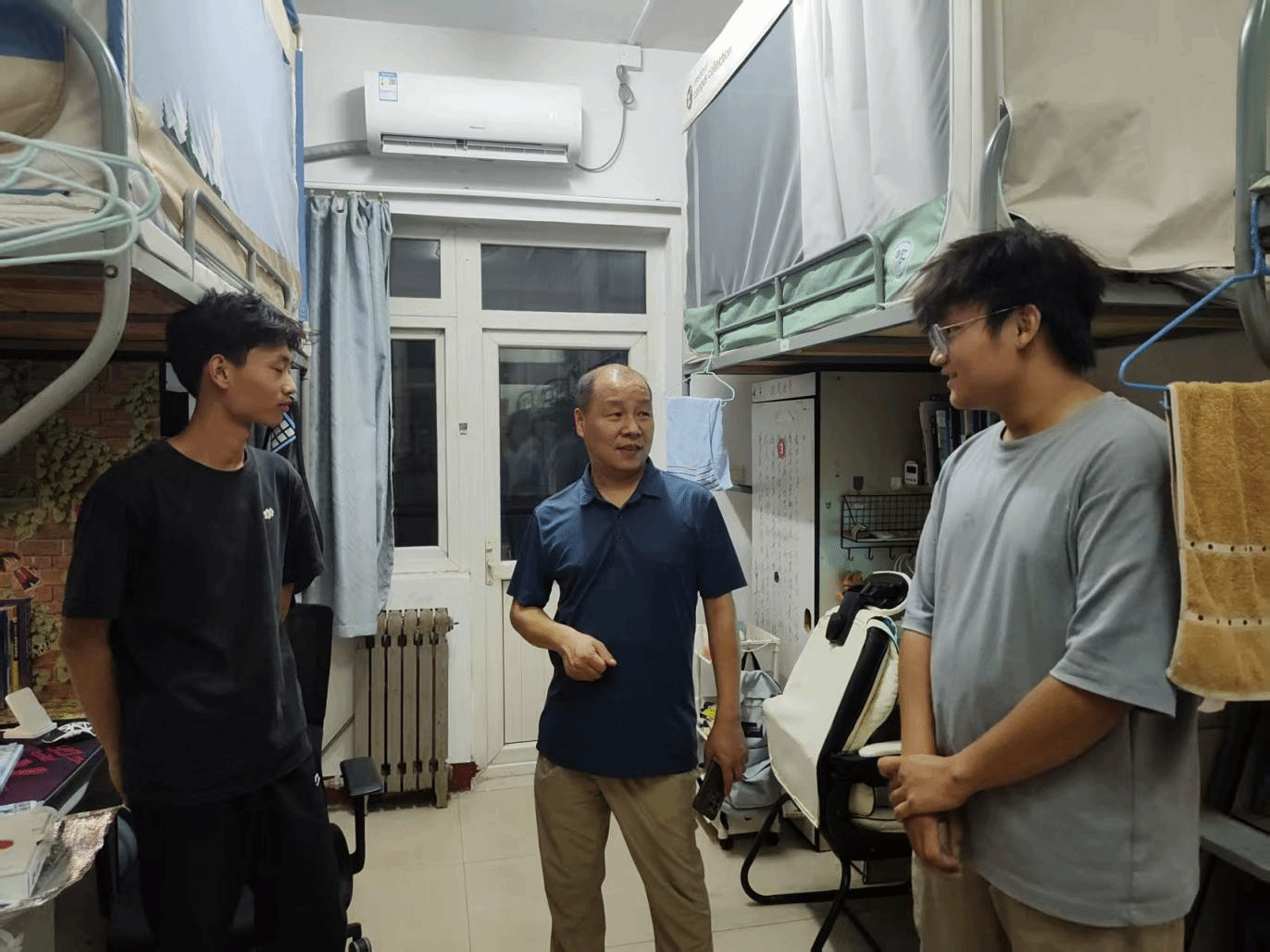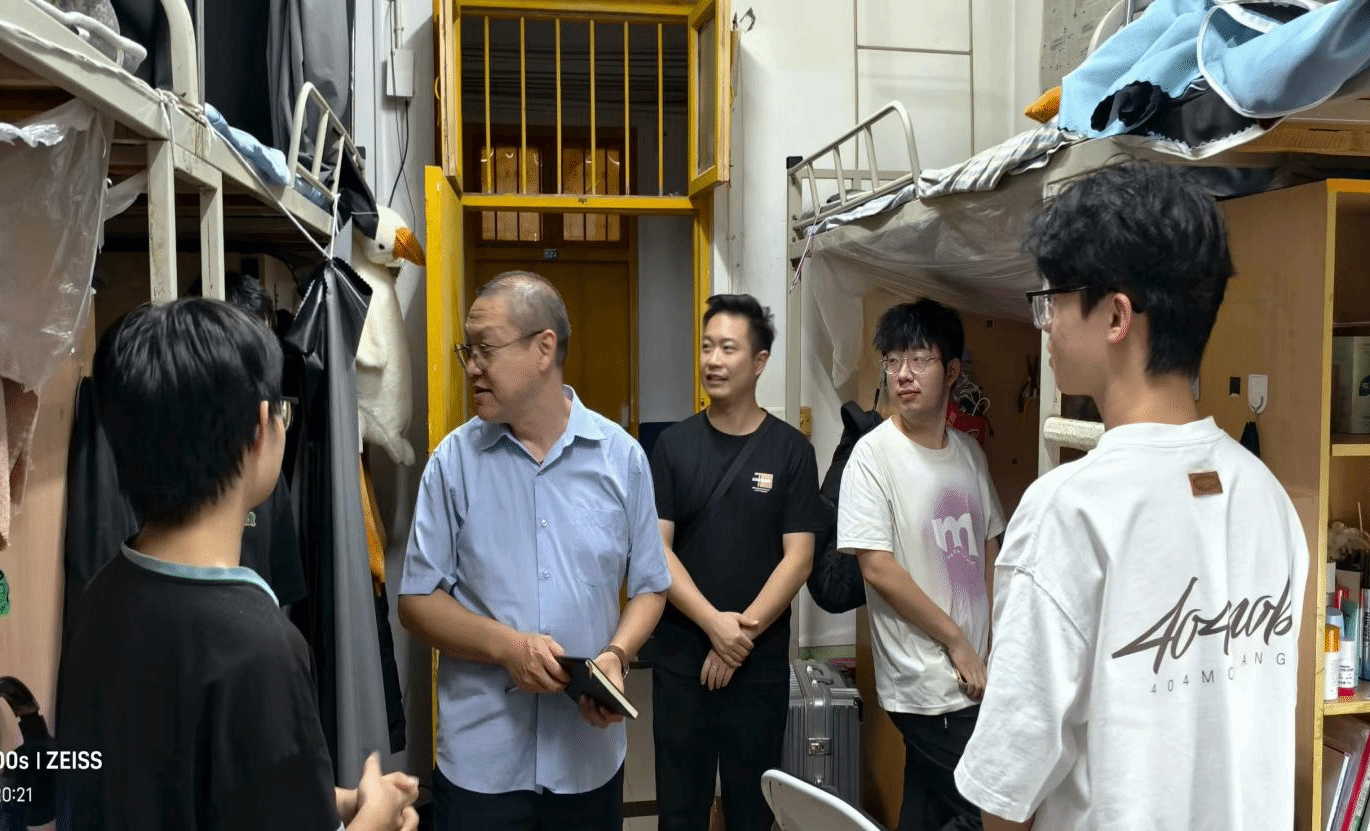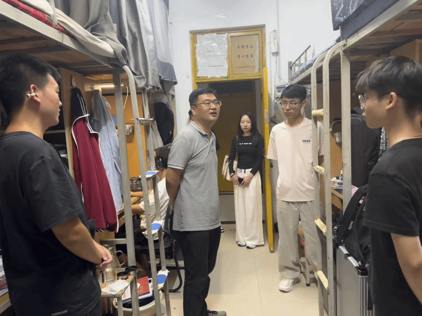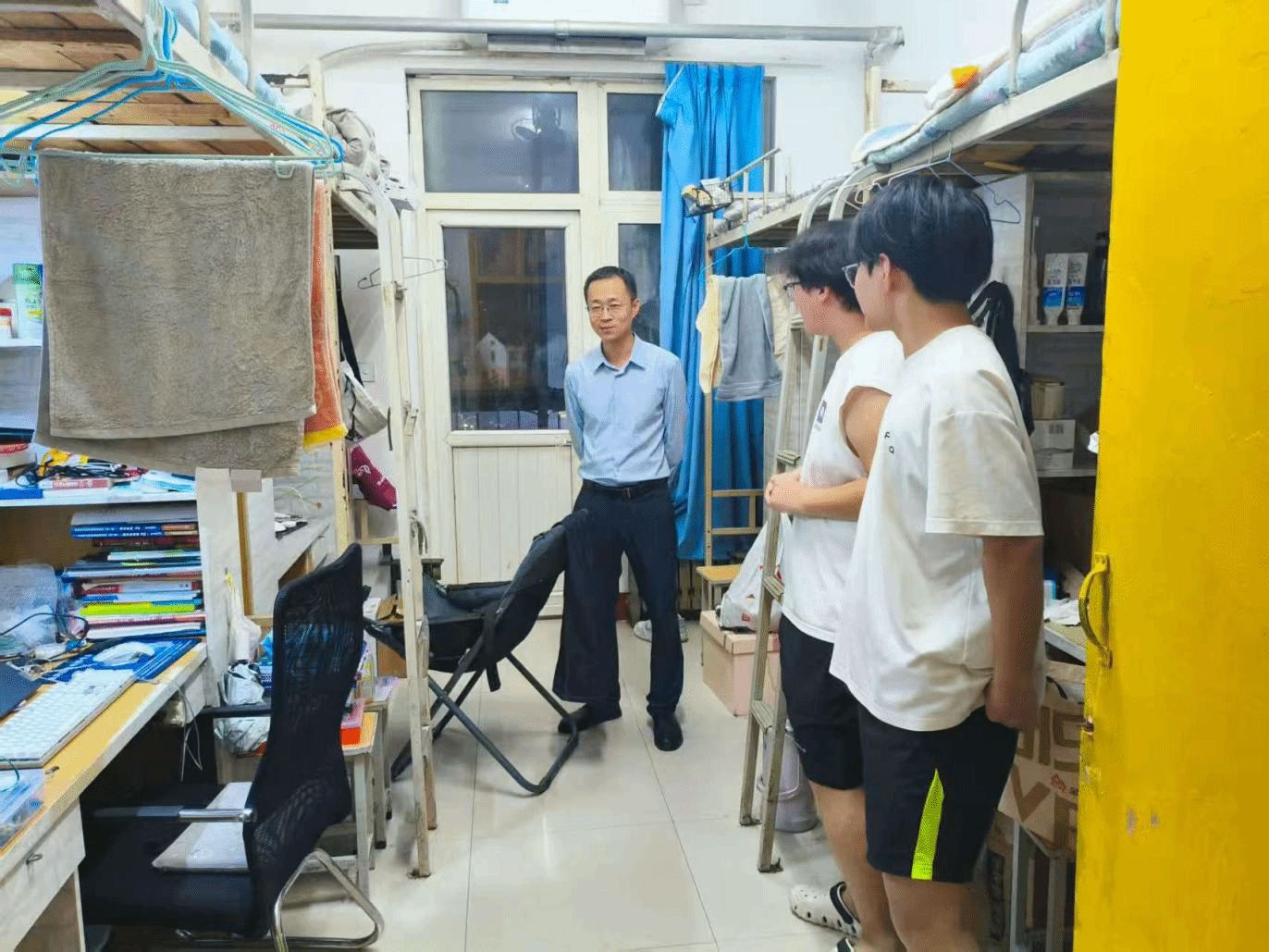 走访过程中,学院领导与学生们亲切交流,详细询问他们暑期的生活经历、学习情况以及对新学期的规划。对于正在准备补考的同学,领导和老师们给予了鼓励与指导,为他们加油打气、提供学习建议,希望大家尽快调整状态,全身心投入学习,顺利通过补考。同时,老师们逐一查看宿舍卫生状况,提醒学生保持桌面整洁、物品有序摆放,营造干净舒适的居住环境;并重点排查宿舍内大功率电器使用、电路插座老化、消防设施配备等安全问题,耐心叮嘱学生增强安全防范意识,杜绝私拉乱接电线、使用违规电器等行为,时刻注意用电、防火安全。