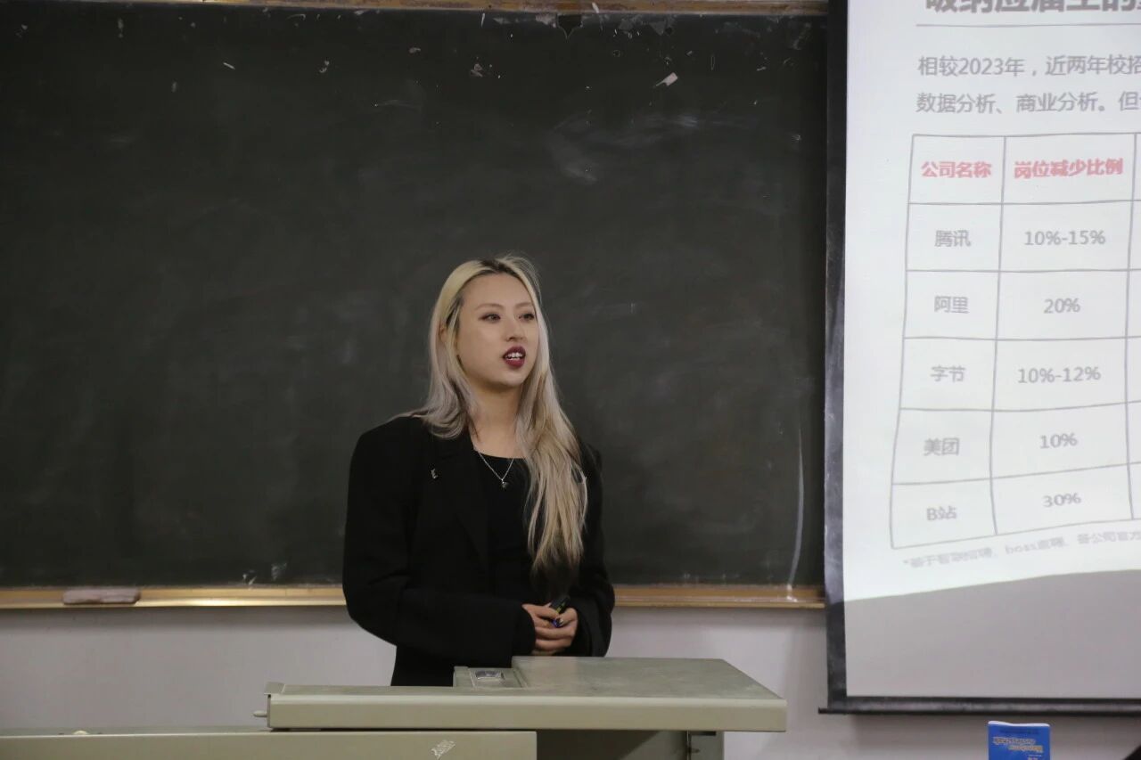 杨紫薇结合自身丰富的职业经历,为同学们深入解读当前就业市场趋势,并分享了精准自我定位和提升核心竞争力的实用方法。她从行业趋势、求职技能提升、个人实践规划等关键维度切入,引导学生科学认知自我、明确职业方向,助力大家构建清晰的职业发展蓝图。