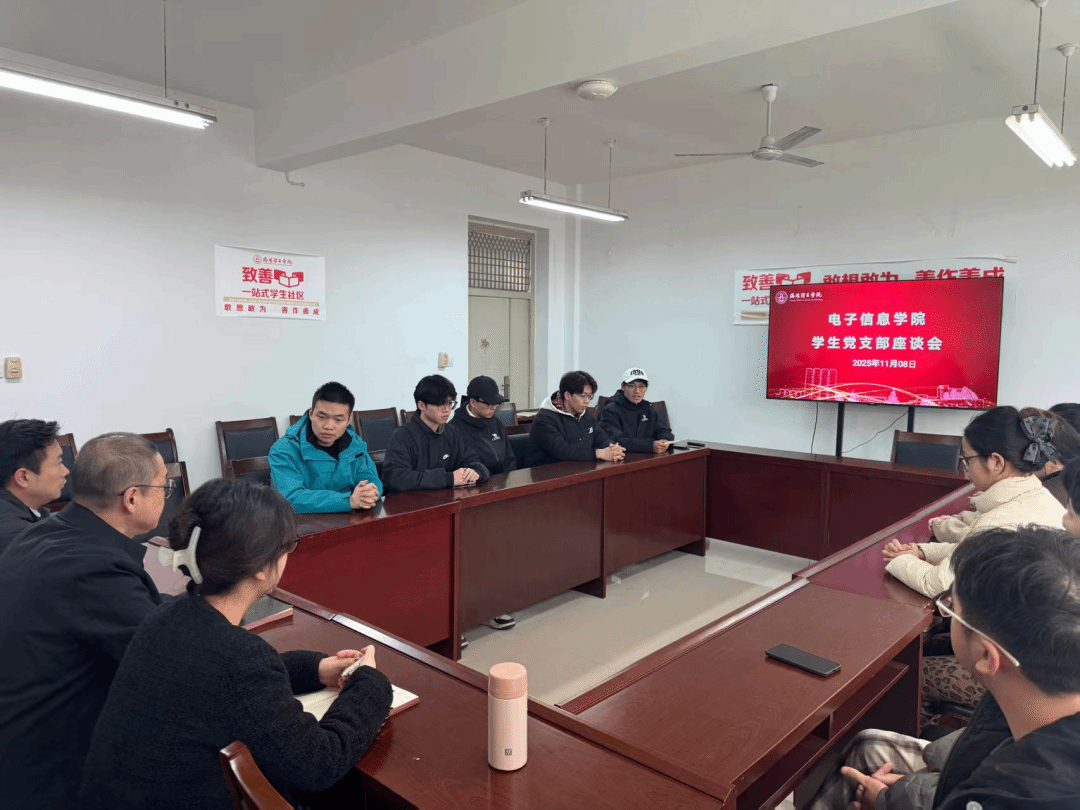 11 月 8 日,电子信息学院在致善社区二楼会议室举办学生党员座谈会。本次座谈会旨在强化学生党员责任意识、发挥先锋模范作用。座谈会由电子信息学院党委副书记陈朝辉主持,学生党支部书记金春阳、赵文婷与电子信息学院全体学生党员共同参会。
