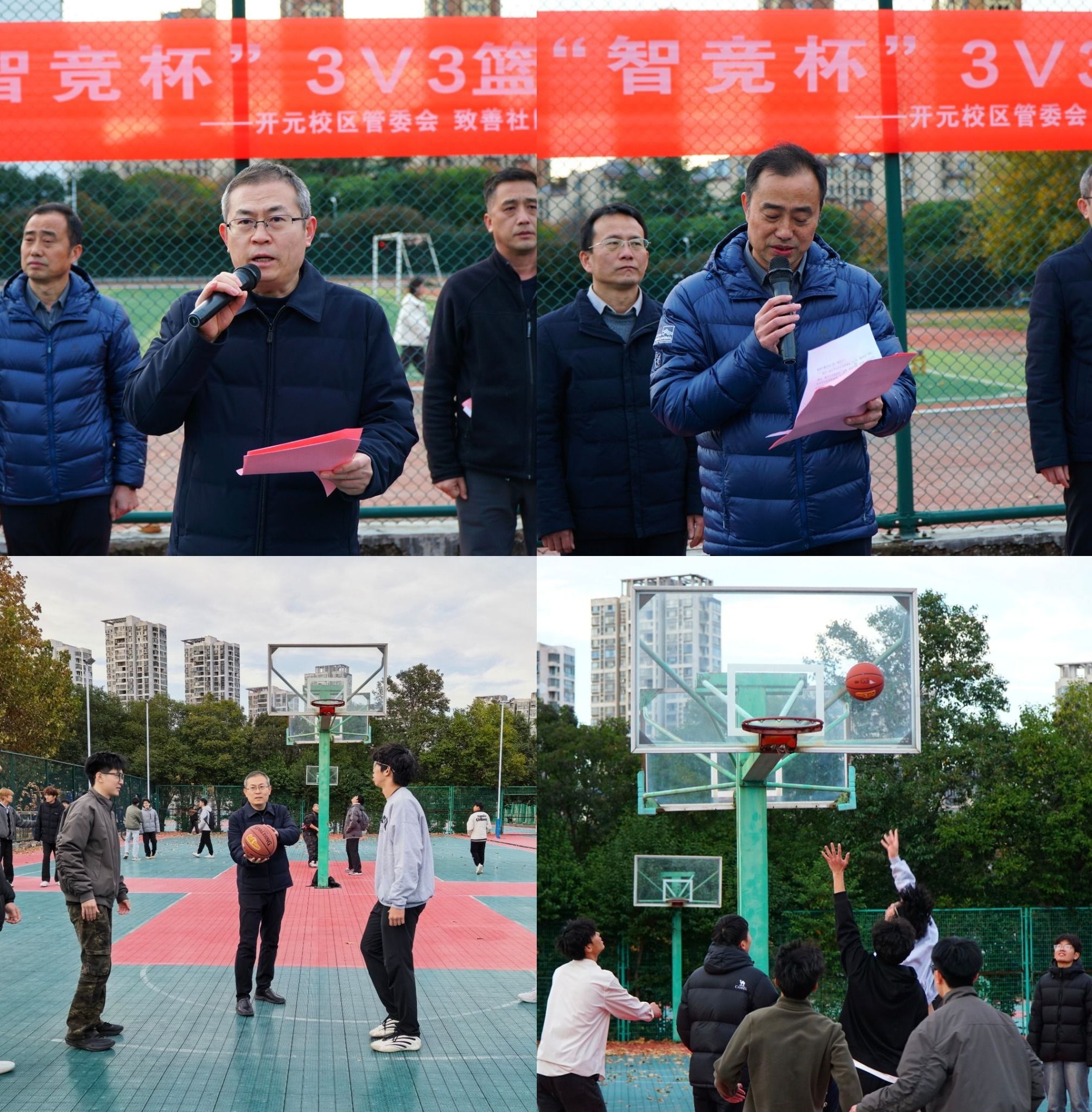 为深入学习贯彻党的二十届四中全会精神,推动治理体系和治理能力现代化向基层延伸,构建协同联动、共建共享的育人格局,实现了管理力量和服务力量向学生一线下沉,11月17日下午,开元校区管委会、致善社区和人工智能学院联合在开元校区西篮球场举行2025年“智竞杯”3v3篮球精英赛开幕式。学校副校长李传锋出席活动,开元校区管委会专职常务副主任张正川、开元校区一站式学生社区主任周志平、副主任田洪攀,人工智能学院党委书记武建伟、院长孙泽宇、党委副书记刘亚钦以及全体辅导员、参赛队员参加。开幕式由武建伟主持。