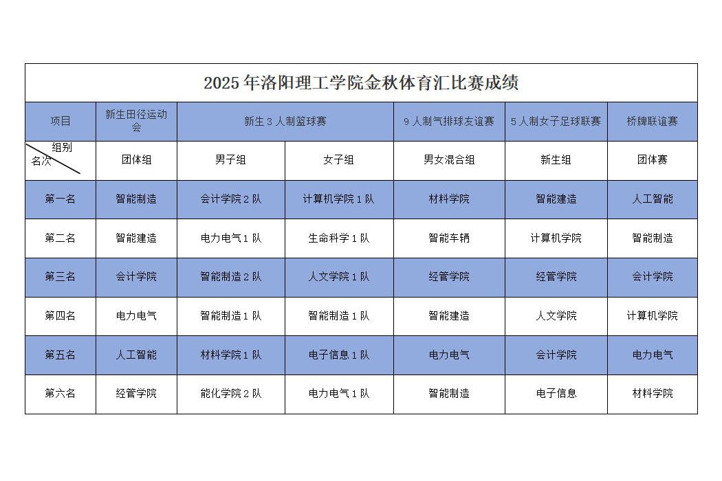 经过近两个月的激烈角逐,各竞赛项目冠军相继诞生。智能制造学院荣获新生田径运动会团体总分第一名;会计学院荣获新生3人制篮球赛男子组冠军,计算机学院/软件学院荣获新生3人制篮球赛女子组冠军;材料科学与工程学院荣获9人制气排球友谊赛团体冠军;智能建造与土木工程学院荣获5人制女子足球联赛冠军;人工智能学院荣获桥牌联谊赛团体赛冠军。