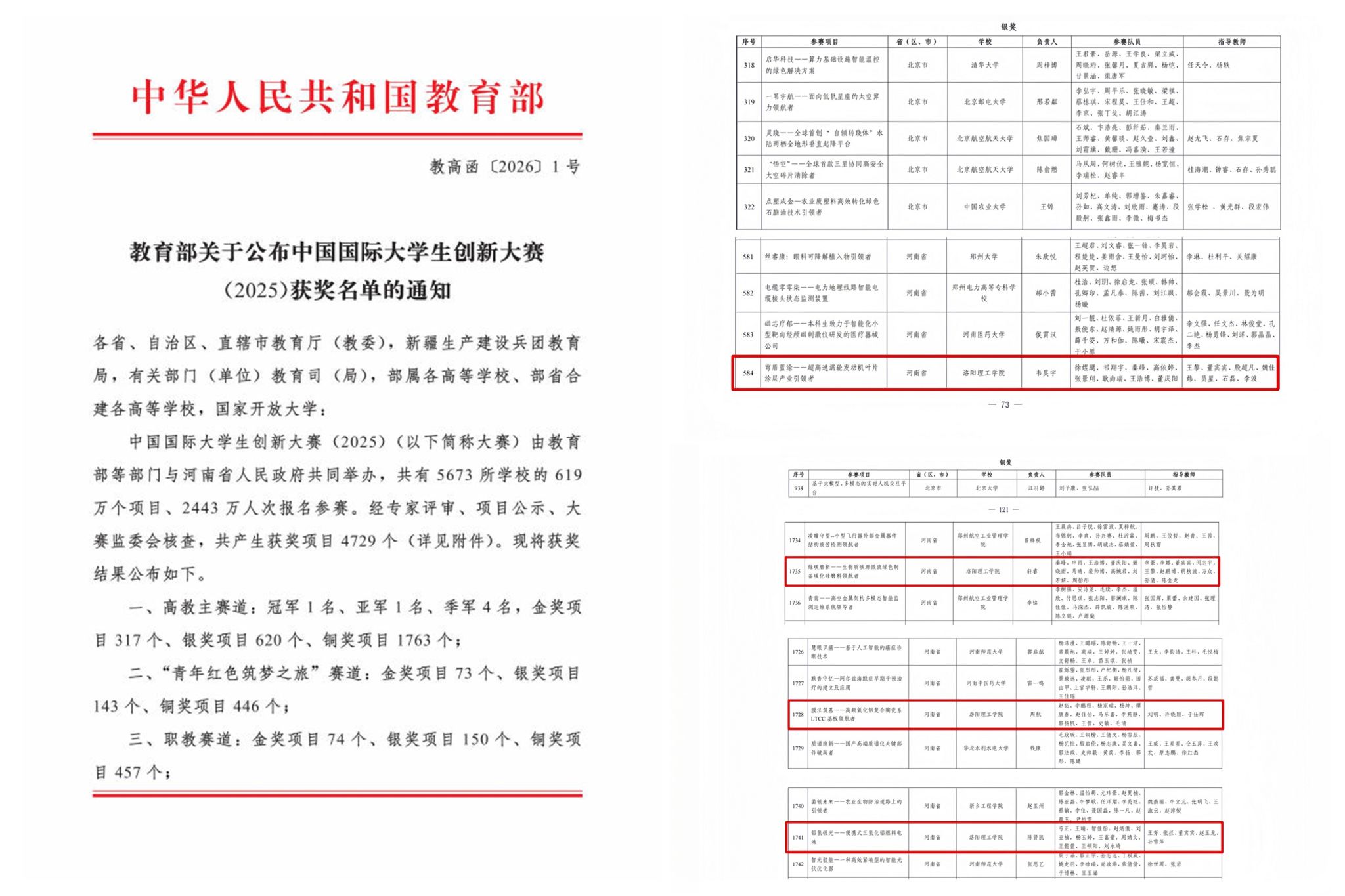 近日,教育部公布了中国国际大学生创新大赛(2025)的获奖名单。我校共荣获国奖4项,包括银奖1项、铜奖3项。