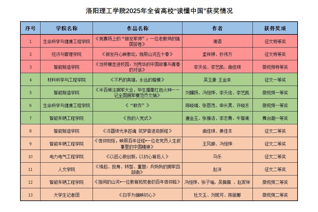 12月9日,省教育厅关工委公布2025年全省高校“读懂中国”活动评审结果(豫教关字〔2025〕24号),我校被评为河南省教育厅关工委“读懂中国”表扬单位;我校推荐的7篇征文作品、5个微视频作品、1个舞台剧作品共获得特等奖3项,一等奖4项,二等奖6项。