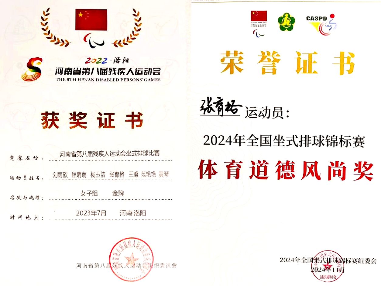 据了解,张育格曾凭借精湛的球技和顽强的作风,在河南省第八届残疾人运动会坐式排球项目中勇夺金牌,荣获2024年全国坐式排球锦标赛体育道德风尚奖。赛场之外的她,早已是同学中身残志坚、奋勇向上的榜样。学业上,她两度获评校级“三好学生”、获校级二等奖学金;热心公益事业,以无偿献血的实际行动被授予“世界红十字日无偿献血先进个人”称号,用点滴善举传递温暖力量。