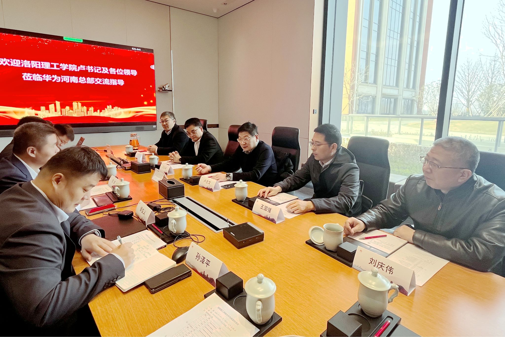廖波对卢志文一行的到来表示欢迎,介绍了华为河南总部和郑州北龙湖园区的基本情况和布局发展。他表示,期待校企双方进行深度全面合作,共同打造联合的现代产业学院。
