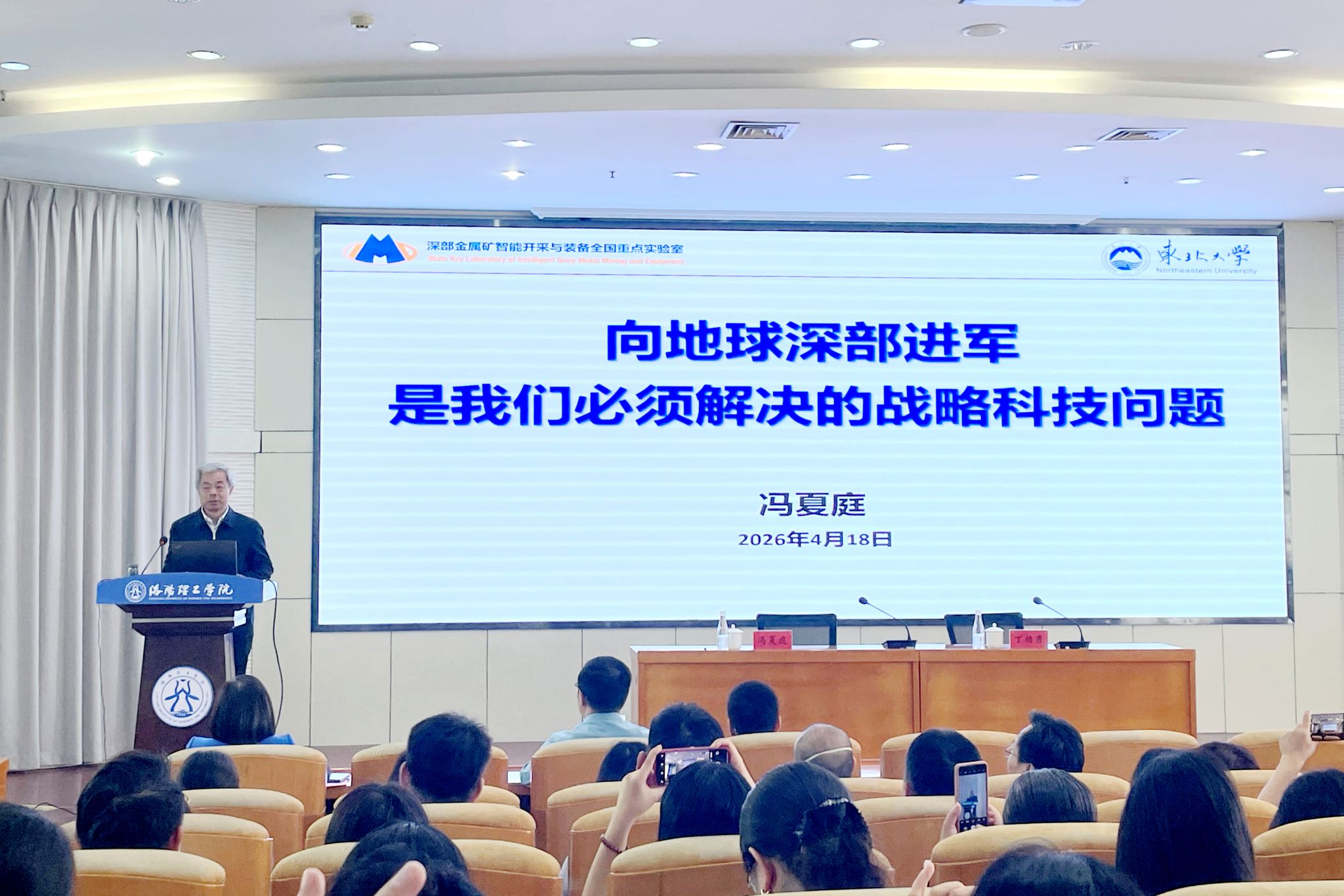 4月18日上午,中国工程院院士、东北大学校长冯夏庭教授应邀莅临我校指导工作并作题为《向地球深部进军是我们必须解决的战略科技问题》的学术报告。校长丁梧秀主持报告会,校长办公室、智能建造与土木工程学院等相关部门负责人和师生代表共同聆听报告。