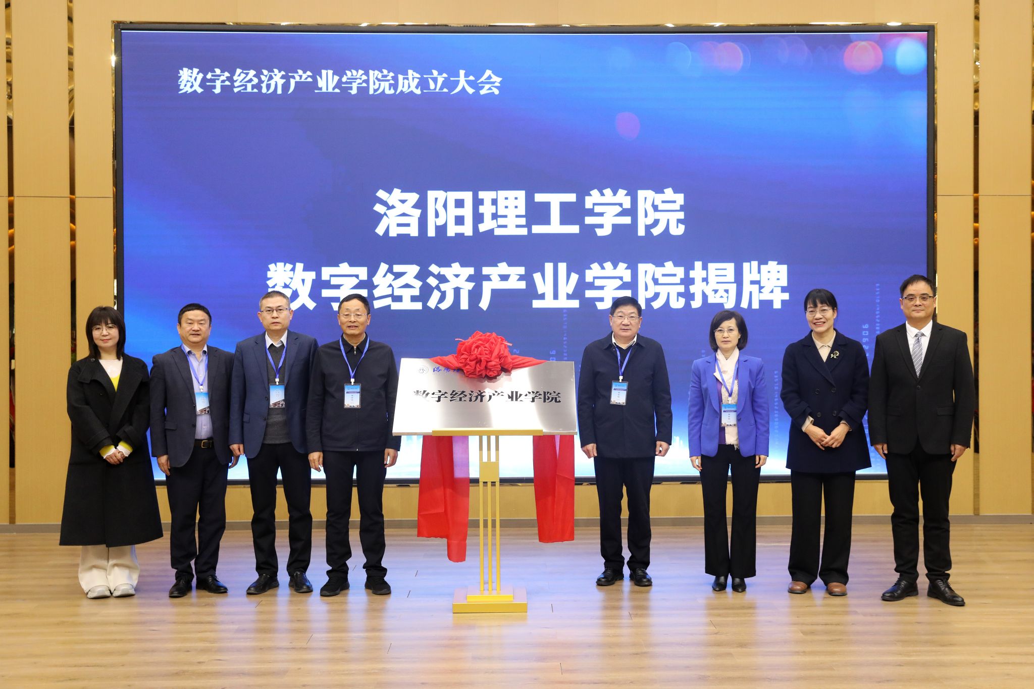 卢志文、丁梧秀、冯超、李传锋、石念峰、张国贤、张会娟、范军均共同为洛阳理工学院数字经济产业学院揭牌。
