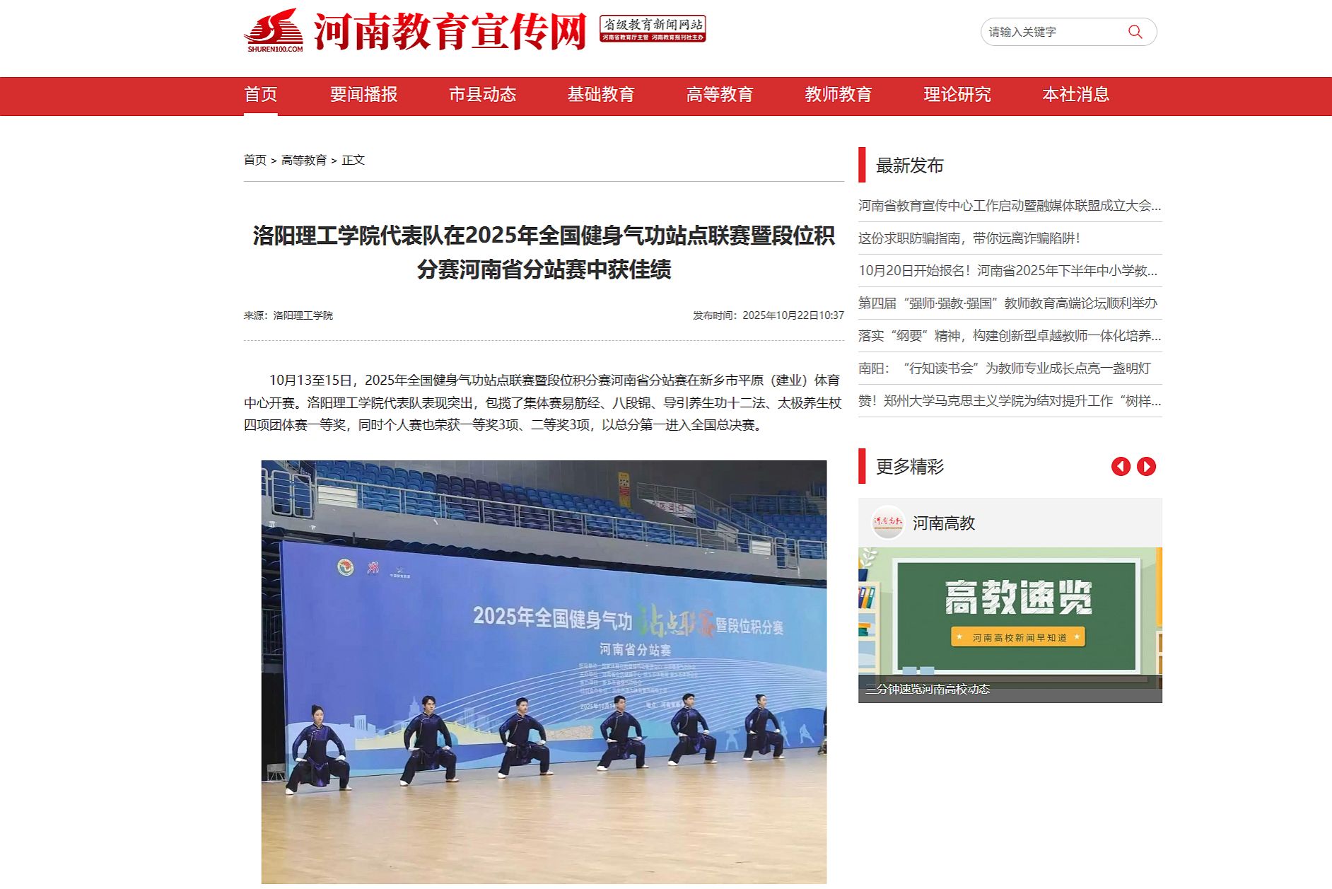 河南教育宣传网,2025年10月22日,《洛阳理工学院代表队在2025年全国健身气功站点联赛暨段位积分赛河南省分站赛中获佳绩》