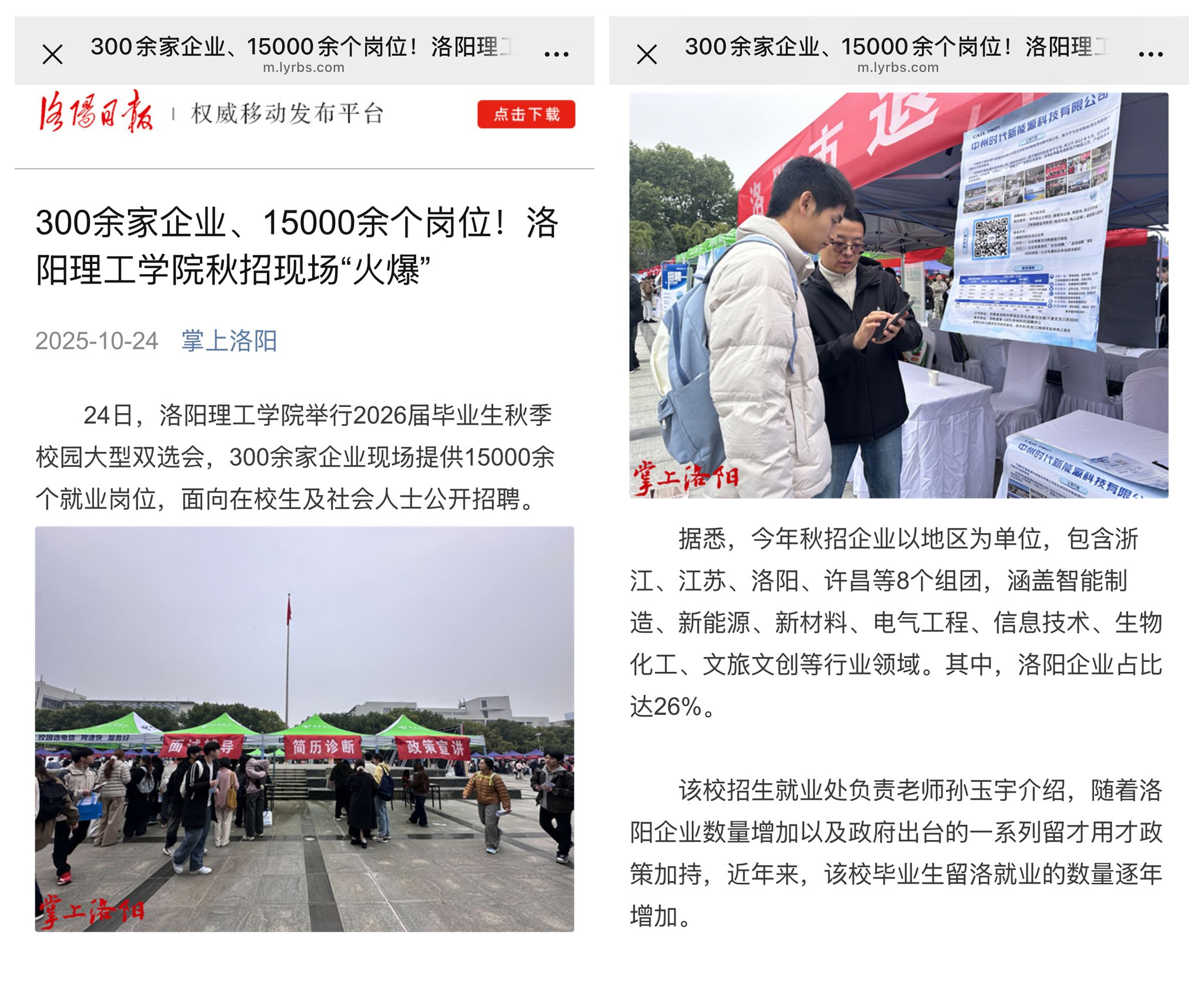 《洛阳日报》掌上洛阳移动客户端,2025年10月24日,《300余家企业、15000余个岗位!洛阳理工学院秋招现场“火爆”》