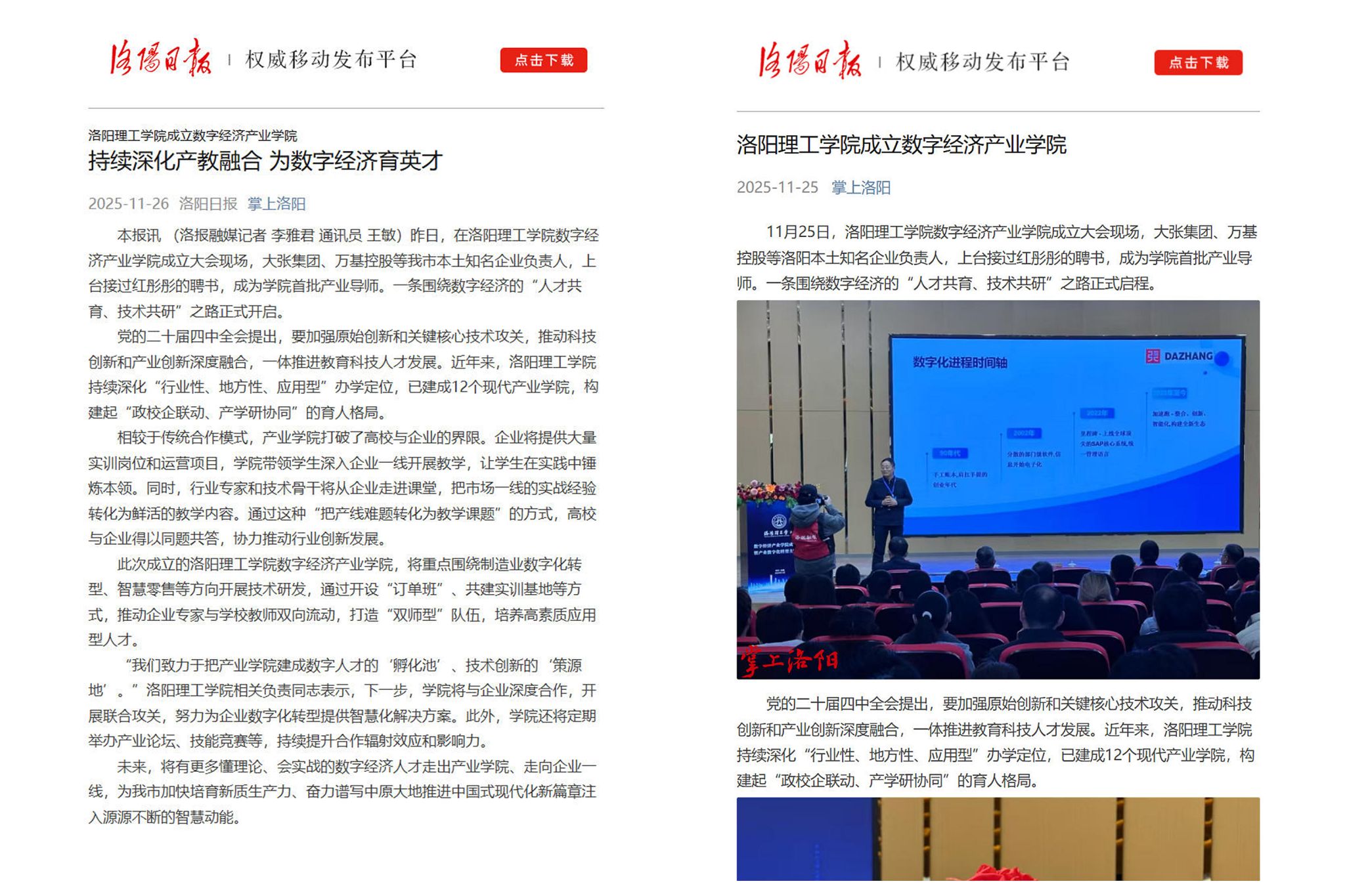 4.掌上洛阳移动客户端,2025年11月26日,《洛阳理工学院成立数字经济产业学院 持续深化产教融合 为数字经济育英才》