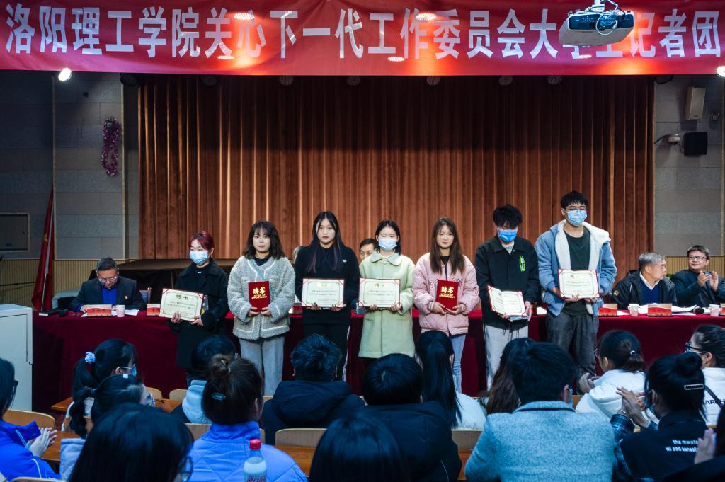 会议宣读了《洛阳理工学院关心下一代工作委员会 共青团洛阳理工学院委员会关于成立关工委大学生记者团的通知》。校关工委常务副主任段治乾教授为大学生记者团顾问李跃进、雷润堂颁发大学生记者团顾问聘书。校关工委副主任郭连治、党委宣传部部长李龙星分别为记者团团长、副团长,记者团各部部长颁发聘书,赠送专业书籍。与会领导共同为大学生记者代表颁发《采访证》。