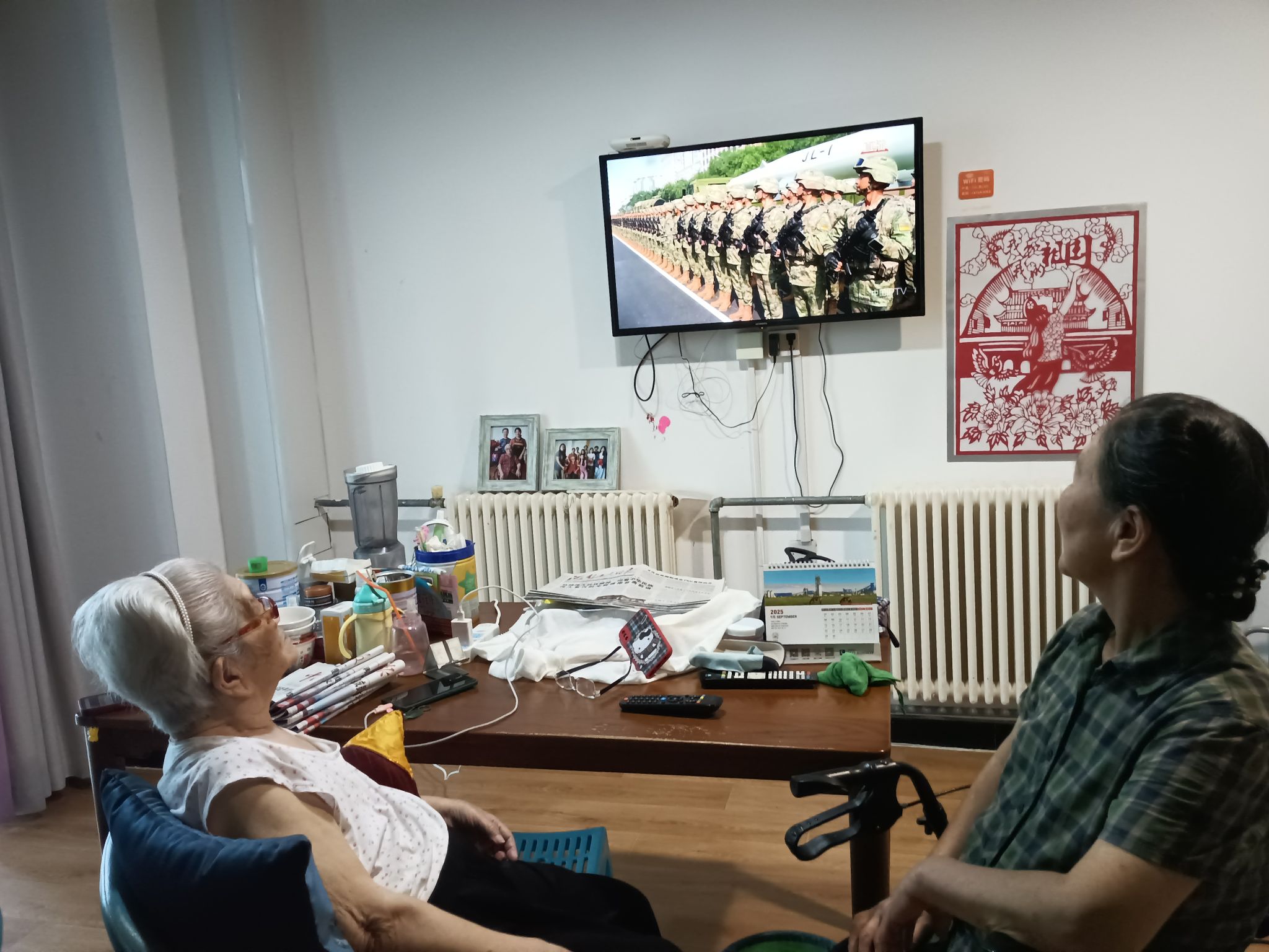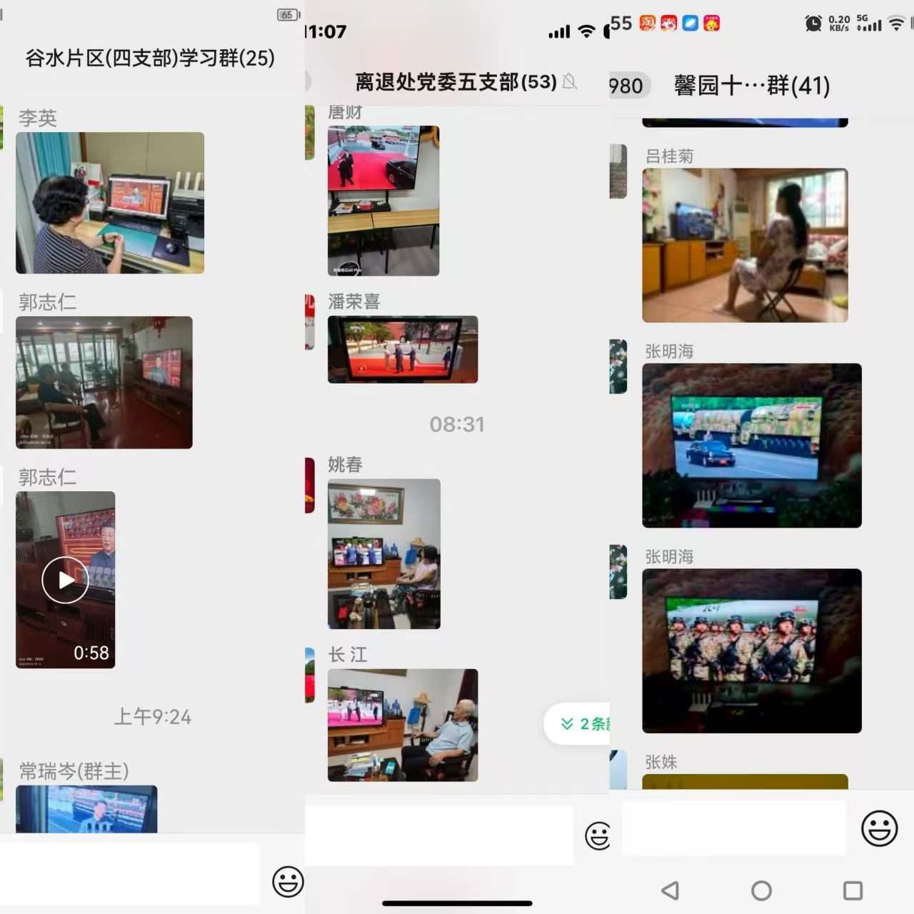 9月3日上午9:00,在职职工及部分退休老同志在馨园活动中心会议室集中观看直播盛况,不时为受阅部队的威武雄姿和先进装备鼓掌喝彩。其他离退休党员则通过电视、网络等形式,认真观看实况直播。直播期间,各支部群里热闹非凡,党员同志们分享观看图片,为祖国的强大实力倍感自豪。