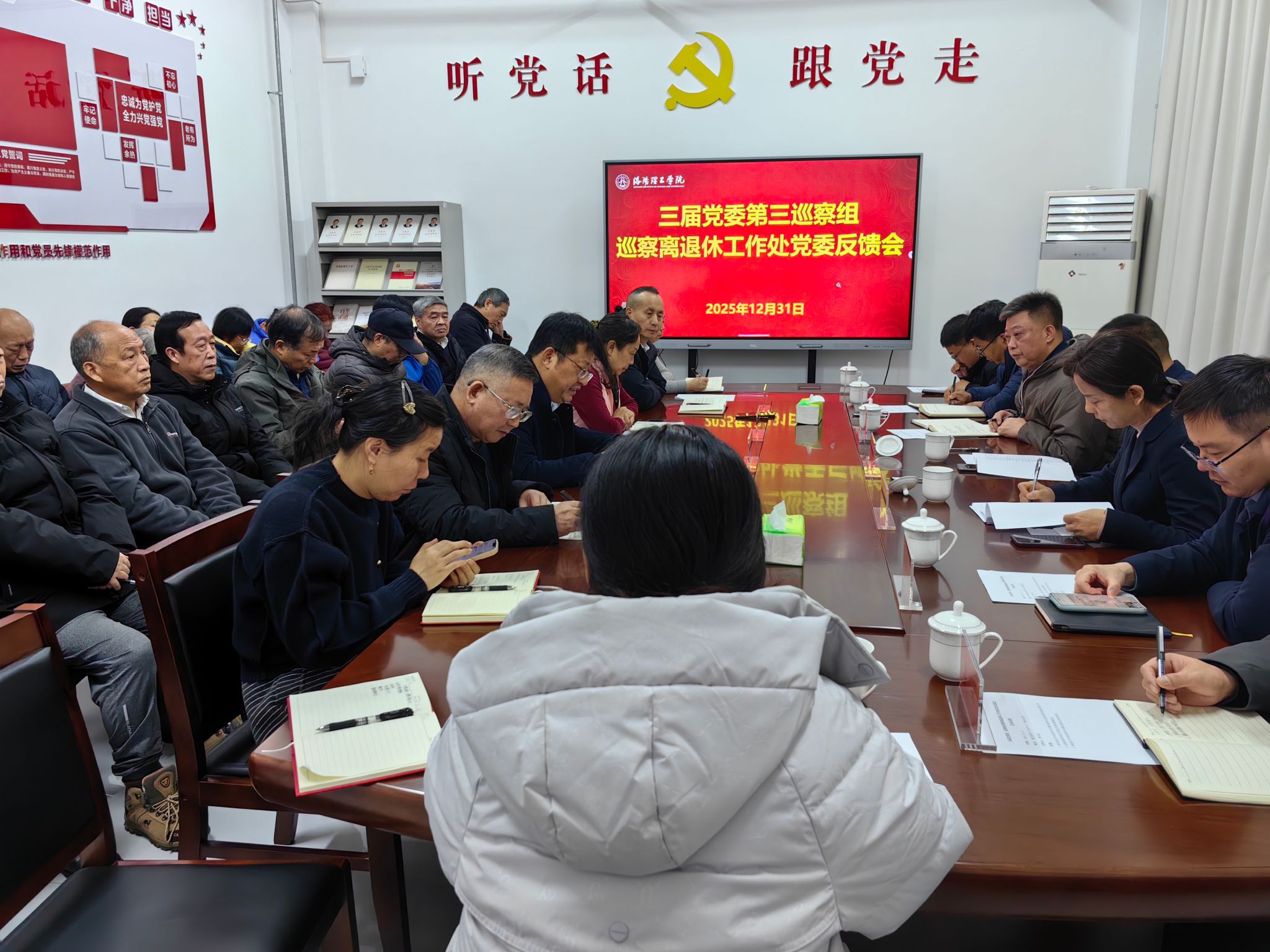 2025年12月31日,三届党委第三巡察组巡察离退休工作处党委反馈会在馨园活动中心会议室召开。校党委巡察工作领导小组成员、宣传部部长侯丙孬,第三巡察组组长杨卫芹,组织部副部长陈智勇,校纪委/监察专员办公室纪检监察室副主任王继忠,巡察组副组长张恒及全体成员出席会议。离退休工作处党委班子成员 、在职党员干部、党支部书记和退休党员代表等参加会议。会议由离退休工作处党委书记、处长曹良奎主持。