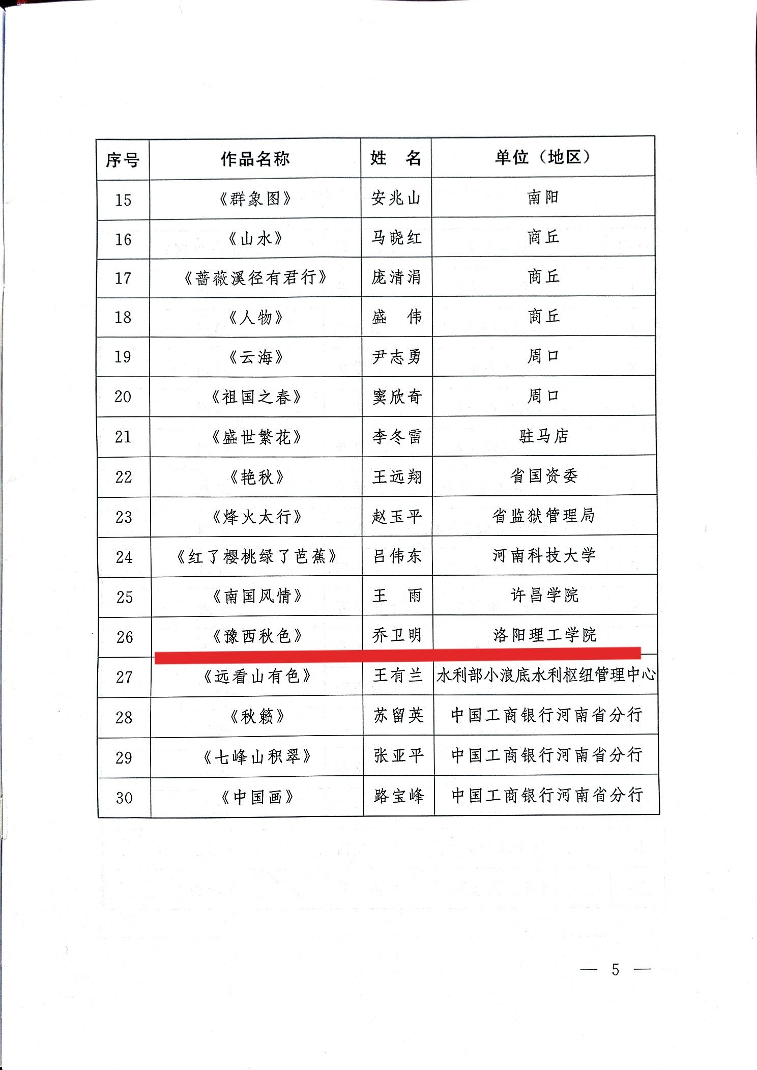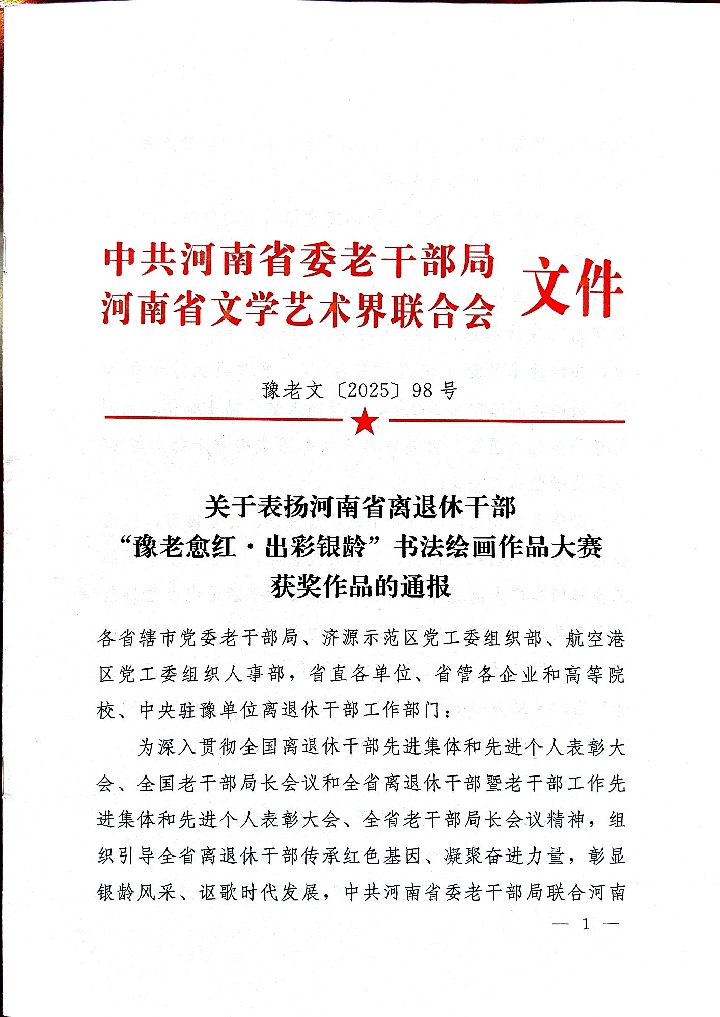 近日,中共河南省委老干部局、河南省文学艺术界联合会联合发文,表彰《河南省离退休干部“愈老愈红·出彩银龄”书法绘画大赛获奖作品及单位》(豫老文[2025]98号),洛阳理工学院离退休工作处获全省获表扬单位,是授予“表扬单位”五所高校之一,退休教师乔卫明的绘画作品《豫西秋色》获入围奖。