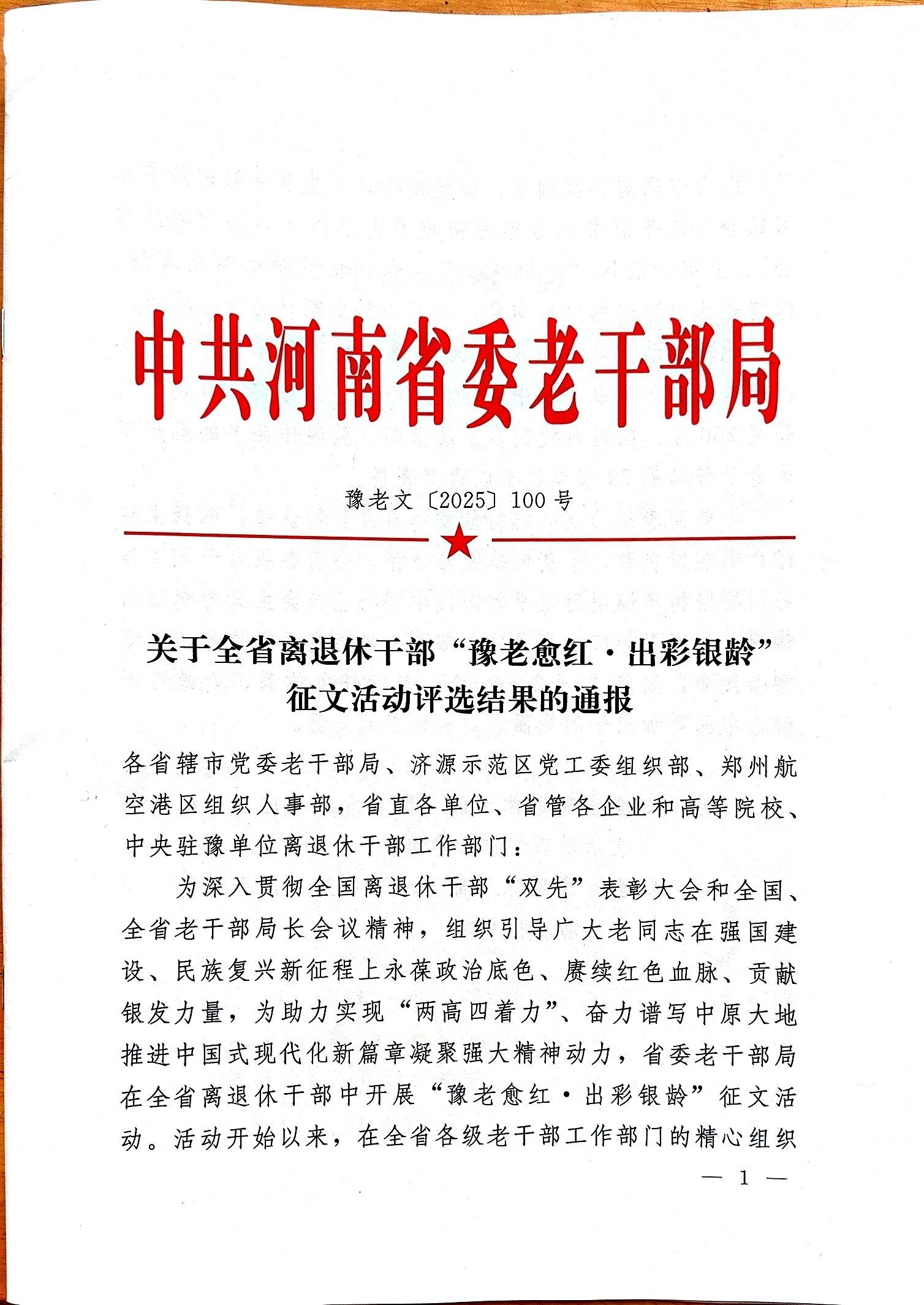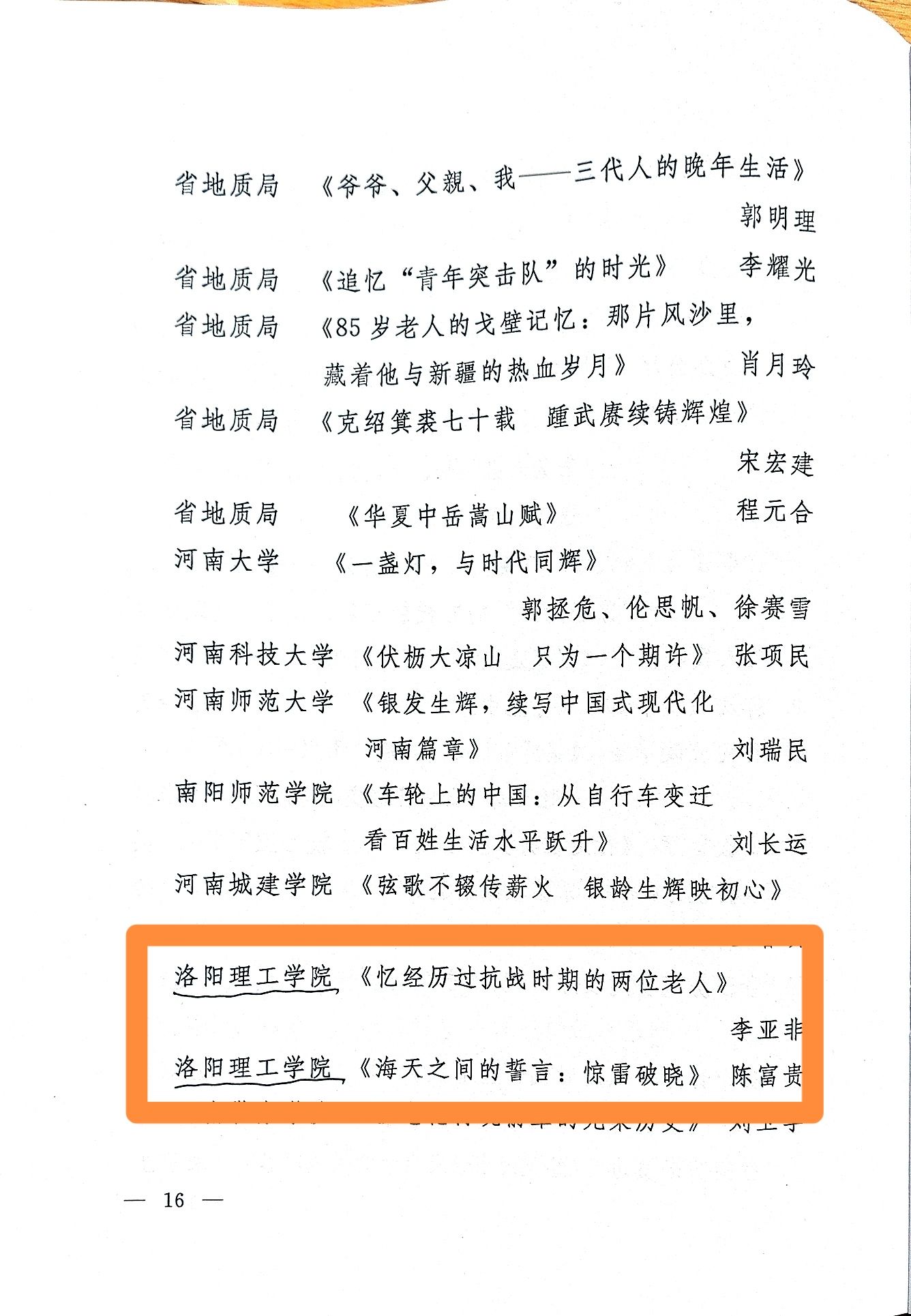 中共河南省委老干部局《关于全省离退休干部“豫老愈红出彩银龄”征文活动评选结果的通报》(豫老文[2025]100号),我校离退休工作处获得表扬,我校退休教师李亚非的作品《忆经历过抗战时期的两位老人》、陈富贵老师的作品《海天之间的誓言:惊雷破晓》获二等奖。