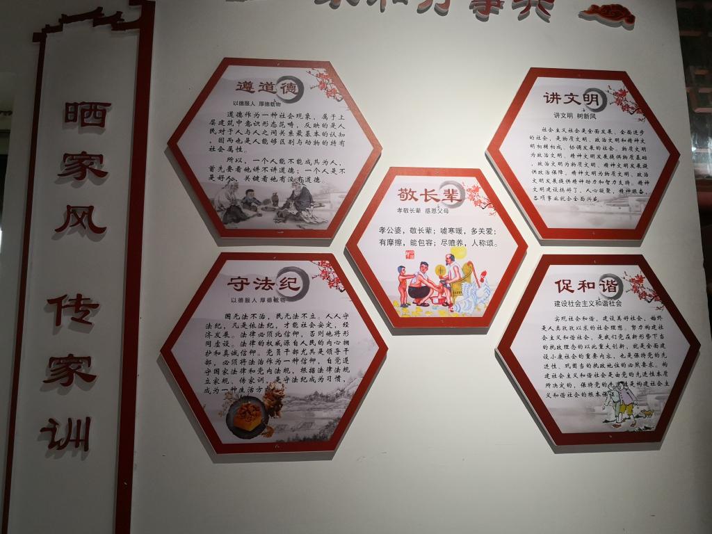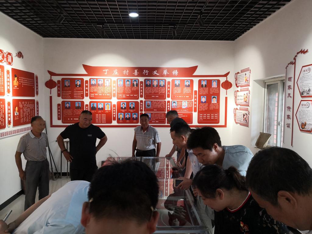 丁庄村家风家训馆面积近70平米,馆内共分为丁庄村简介、家风家训歌、二十四孝图、善行义举榜四个展区。在这里,大家了解到丁庄村的悠久历史、名人事迹和流传下来的家训族训,及当下丁庄村文明乡风的培育:村委会充分利用农家书屋、文化广场,举办文化惠民活动;广泛评选“好媳妇好婆婆”“星级文明户”“五美庭院户”,选树先进典型;每年的重阳节,开展丰富多彩的敬老孝老活动。参观中,大家感受到丁庄村开展的一系列活动丰富多彩,接地气,深得民心。