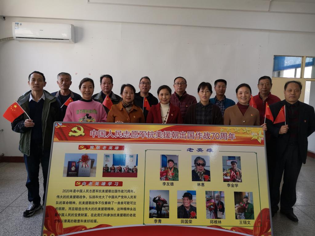 环节三:26日下午,七支部全体党员在“抗美援朝出国作战70周年”展板前进行学习。离退处负责人给全体党员上了一场生动的党课,并详细介绍了目前健在的林惠、李友德、李金学、李青、王锡文、田国荣、邱根林7位抗美援朝老战士,虽均是耄耋之年,他们却依然初心不改,平日里,在家看报、听广播、听子女读读离退休处送学上门的学习资料……时刻关心着国家大事,始终关注着学校发展动态。