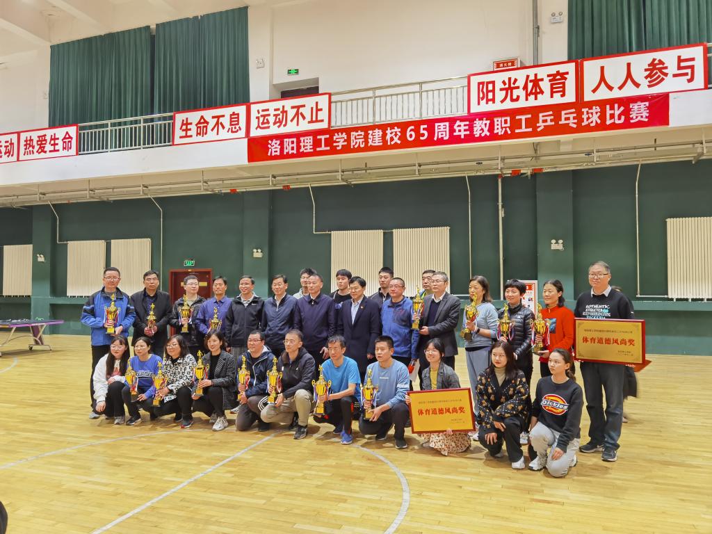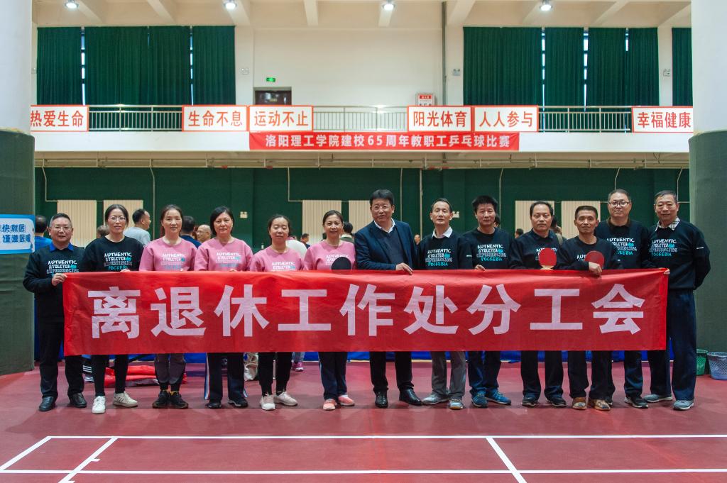 10月27至29日,离退休工作处分工会组织参加了“洛阳理工学院建校65周年教职工乒乓球比赛”,全校共有20多个部门的48支队伍参加比赛。在第一轮的男、女团体比赛中,离退休工作处分工会团结协作、积极配合,拼搏向上、敢打硬拼,展示了良好的团队协作精神和积极向上的精神风貌,获得“体育道德风尚奖”,为我校65周年校庆增添了一抹靓丽的色彩。