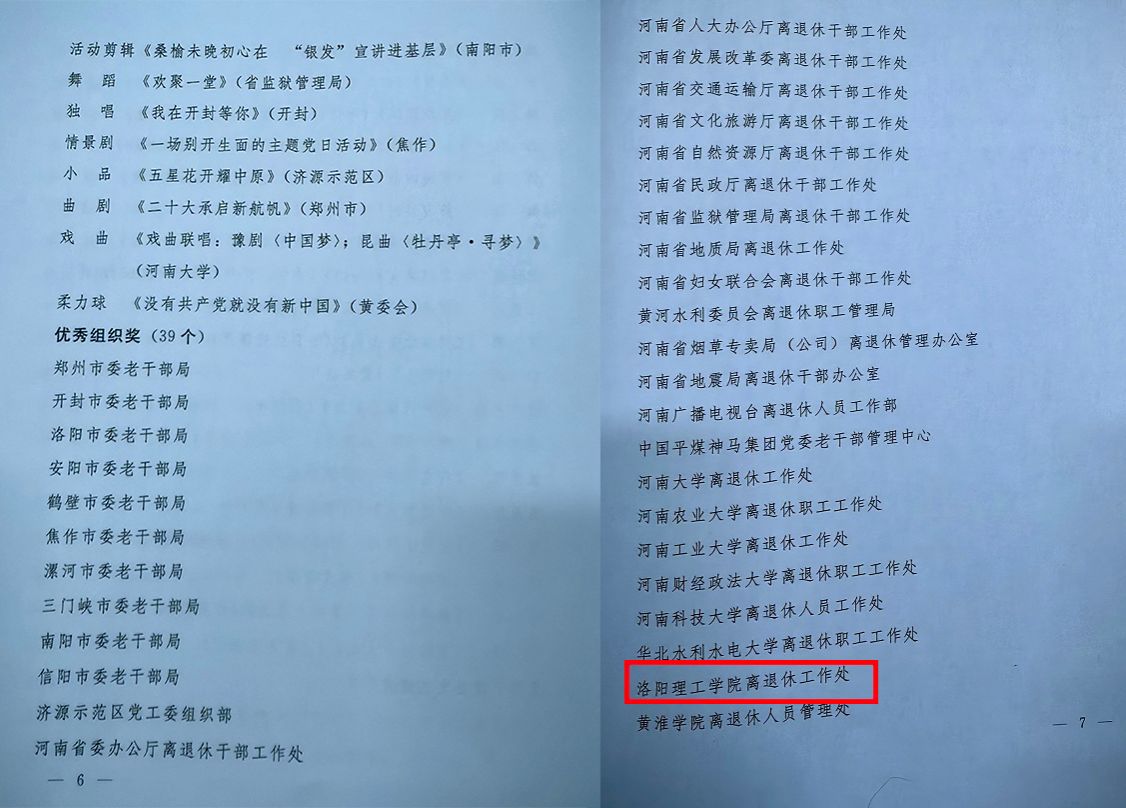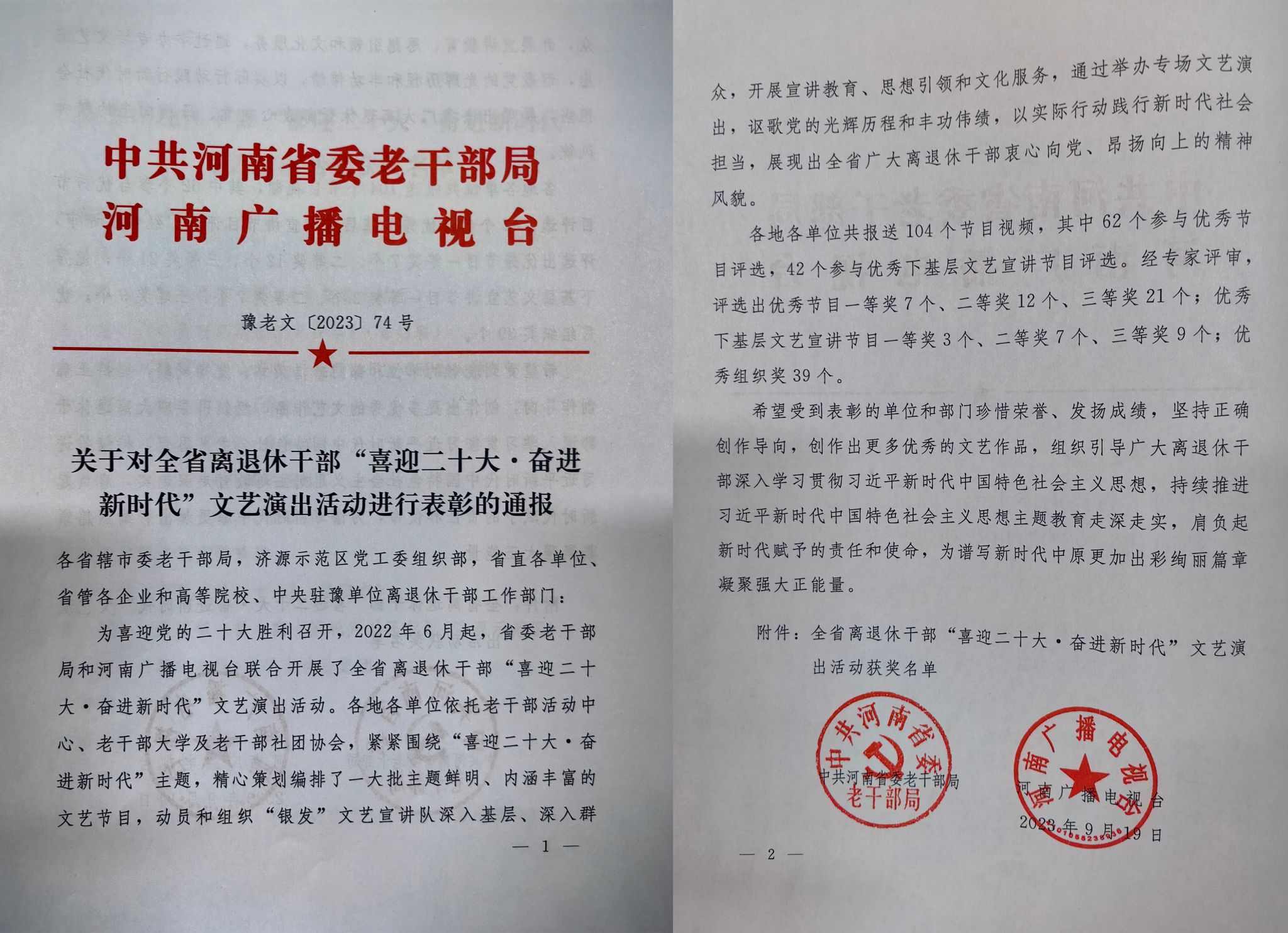由河南省委老干部局、河南广播电视台联合举办的全省离退休干部“喜迎党的二十大·奋进新时代”文艺演出微视频评选结果揭晓,离退休工作处喜获“文艺演出组织奖”。