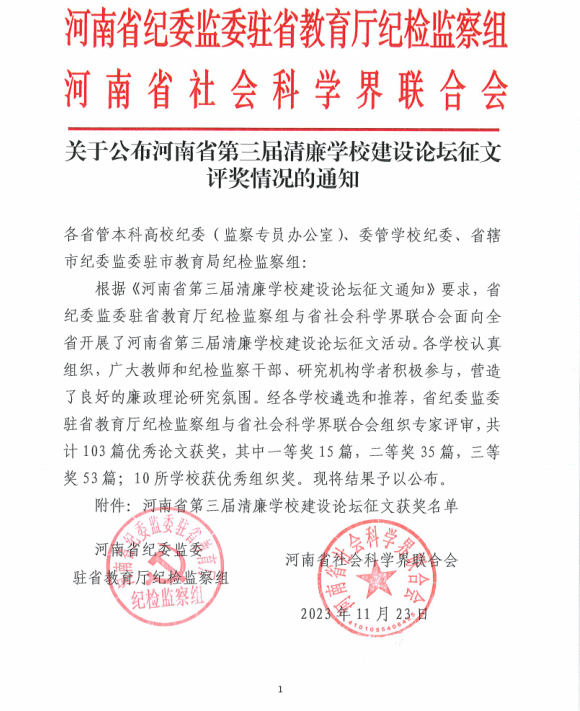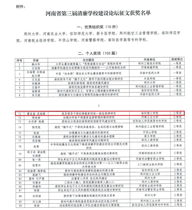 在河南省纪委监委驻省教育厅纪检监察组与省社会科学界联合会面向全省开展的河南省第三届清廉学校建设论坛征文活动中,洛阳理工学院离退休工作处曹良奎、吴相锋撰写的《党员领导干部纪律教育同体一致性规律研究》文章获得优秀论文奖三等奖的殊荣,且该文章在学校2023年度“清廉学校建设”主题征文活动中荣获一等奖。