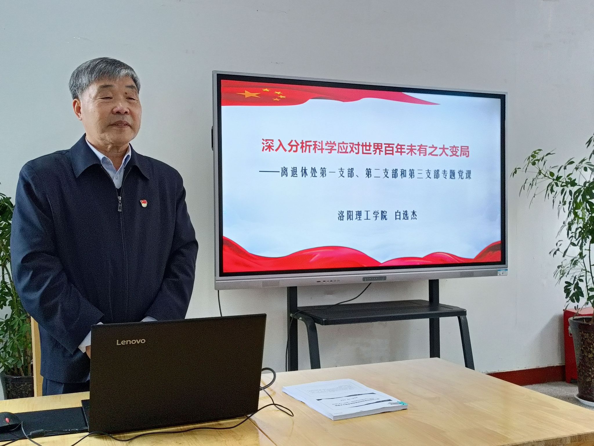 为将主题教育的总要求“学思想、强党性、重实践、建新功”走深走实,12月13日—20日,离退休工作处党委邀请河南省优秀宣讲专家、我校退休教师白选杰教授,先后为绿园片区、馨园片区和珠江路片区共计7个党支部,200多名离退休党员上专题党课——《深入分析科学应对世界百年未有之大变局》。
