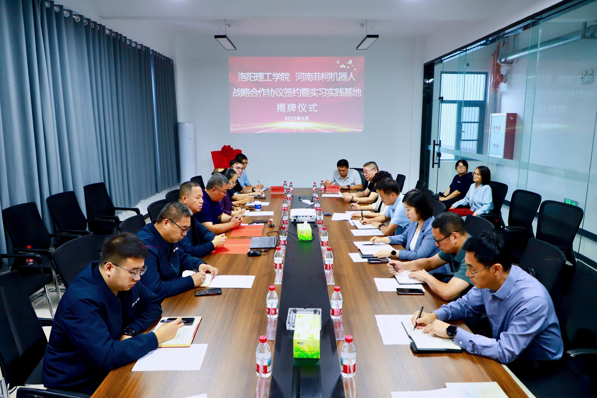 9月4日,我院院长孙泽宇、副院长聂雅琳、机器人工程系主任季晔、教学秘书张扬一行四人赴河南菲柯智能机器人公司商讨合作签约暨校企产学研实习实践基地揭牌仪式。渑池县委副书记、县长周详,县委常委、组织部部长薛莎,县先进制造业开发区党工委书记、管委会主任张光华,县政府副县长姚开胜,河南菲柯智能机器人公司总经理史东明出席会议。