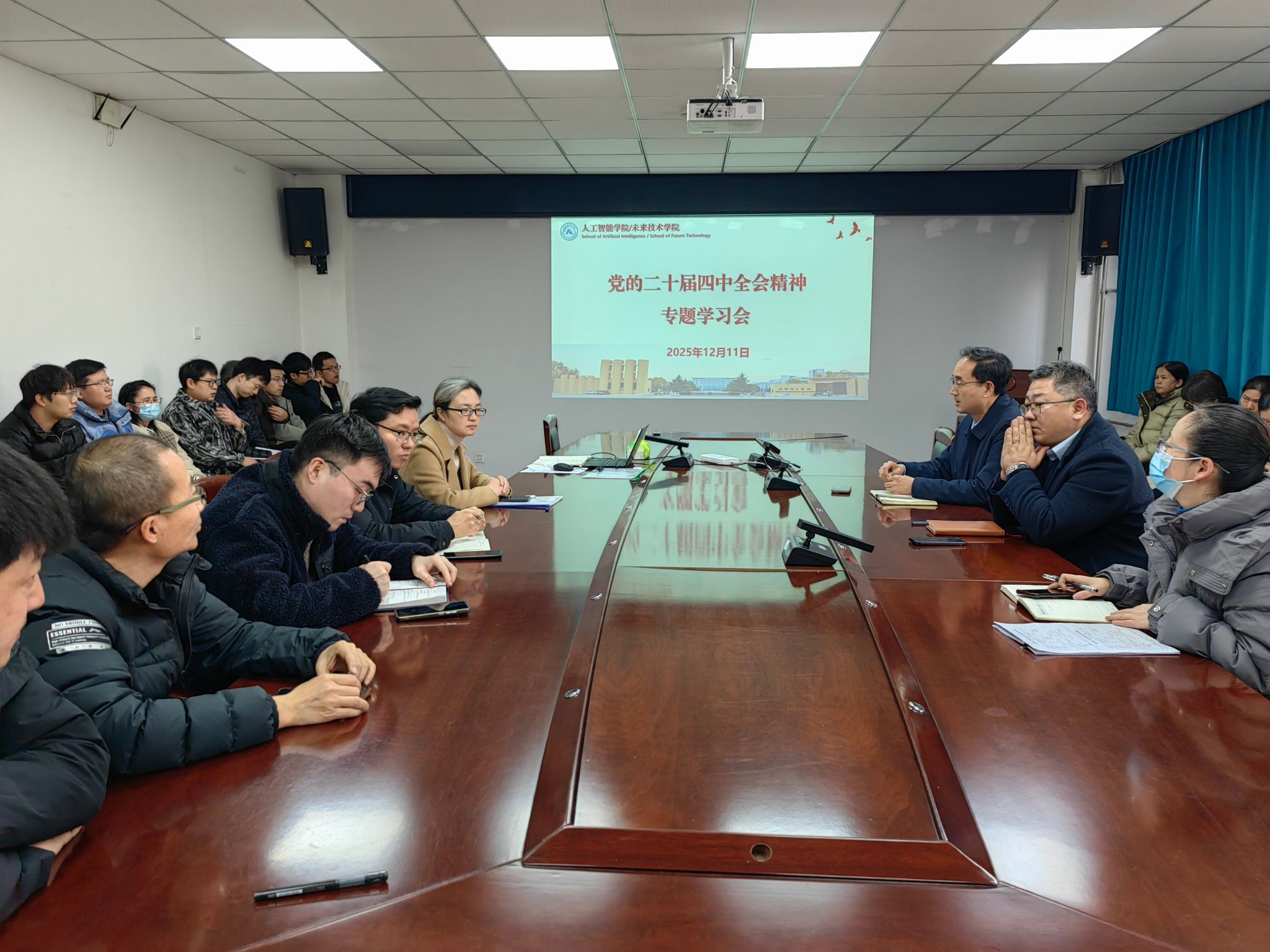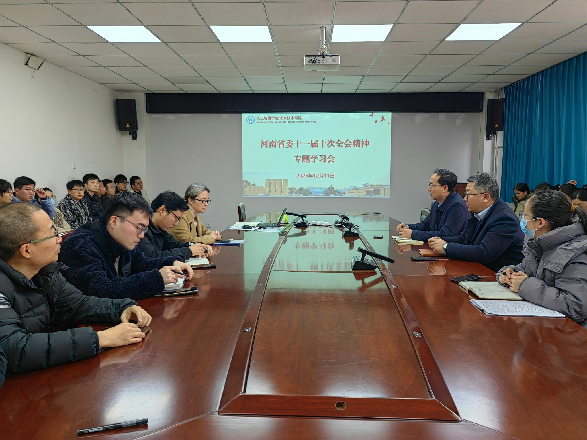 结合学院实际,武建伟提出三点要求:一要提高政治站位,深化理论学习,将学习贯彻党的二十届四中全会精神和河南省委十一届十次全会作为当前与今后一个时期的重要政治任务,持续学深悟透“两高四着力”“1+2+4+N”“7+28+N”等核心概念,切实把思想和行动统一到中央和省委的决策部署上来;二要立足学科特色,推动融合发展,充分发挥人工智能学科优势,主动对接国家科技自立自强战略和河南省产业转型升级需求,在人才培养模式改革、关键核心技术攻关、产学研协同创新等方面精准发力,把学习成果转化为发展实效;三要强化责任担当,狠抓工作落实,全体教职工要以务实作风履职尽责,在各自岗位上奋勇争先,为学院高质量发展和河南推进中国式现代化建设贡献智慧与力量。