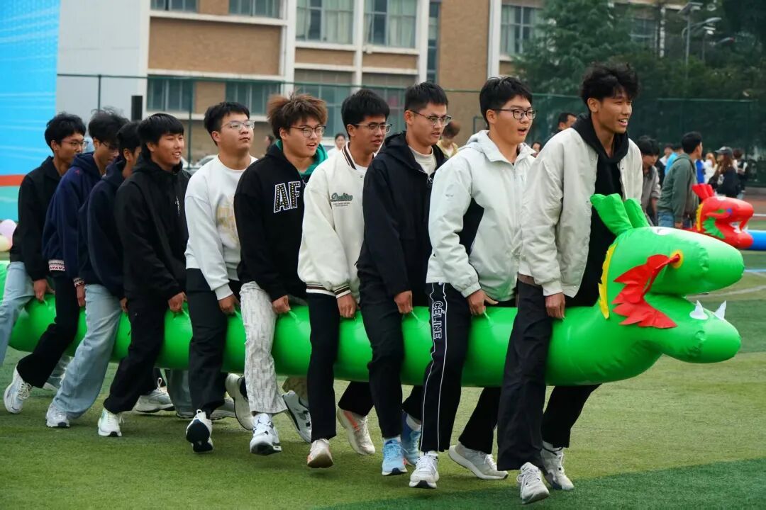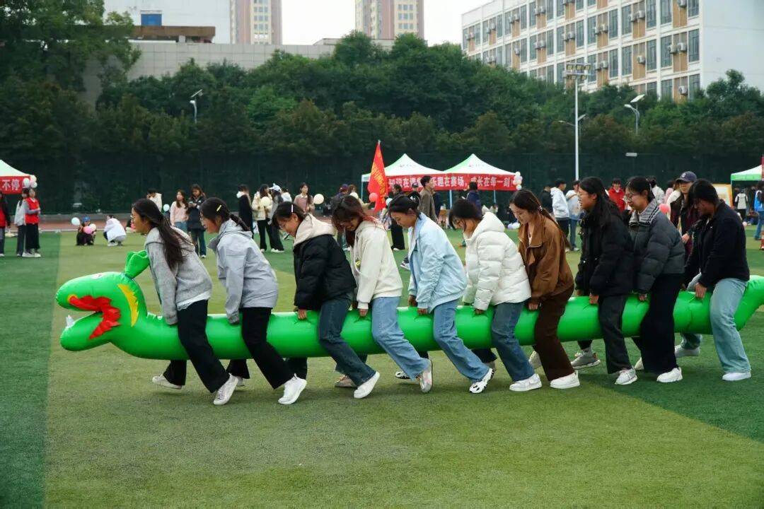 “龙飞凤舞”的赛场旁,长绳如银练翻飞。队员们排成一竖列,前一人刚跃过绳弧,后一人便紧接而上,绕着摇绳者快步折返。“垫球接力”区更显默契:两端队员间隔2米,抛球者手起球落,对面队员精准垫回,球在空中划出流畅弧线。“蛟龙出海”的赛道上,10名队员同骑充气蛟龙之上,双手紧握抓手,步伐整齐如一体,“蛟龙”在赛道上稳健前行,交接时的衔接毫无滞涩。现场的加油声与喝彩声此起彼伏,交织成一副团结拼搏、永不言弃的青春画面。
