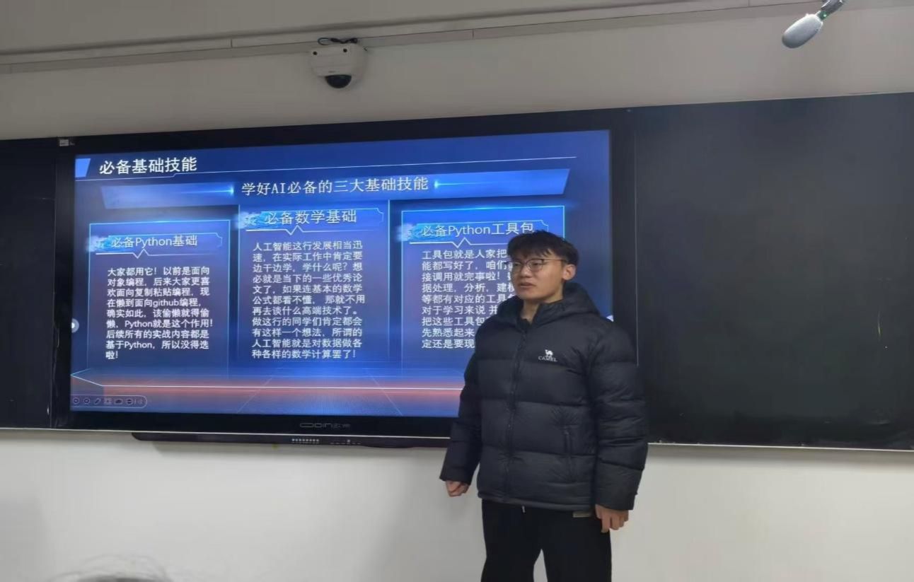 本次座谈会由科创部优秀成员和长期深耕学科竞赛与项目实践的人工智能协会骨干主讲,围绕“AI学习全流程方法”分享:先梳理核心课程(机器学习、深度学习)重点模块,再介绍编程工具(Python、PyTorch)高效练手技巧,最后讲解理论知识与科创项目的衔接路径。主讲人结合自身从基础学习到竞赛实践的成长经历,提供丰富学习经验。人工智能协会主讲人结合协会孵化的校园智能服务、AI图像识别等项目实例,剖析技术选型、团队协作和成果转化的实际操作要点,让分享内容更具可落地性。
