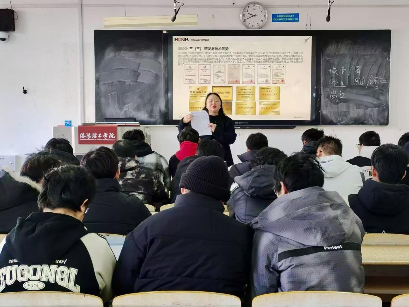12月4日上午,洛阳鸿元轴承科技有限公司人力资源部经理张婷应我院邀请在王城校区公共教学楼AN303举办专场招聘宣讲会暨“导师零距离,就业不迷茫”毕业生就业指导活动。我院就业指导办公室副主任常玉婷和50余名2026届毕业生参会。