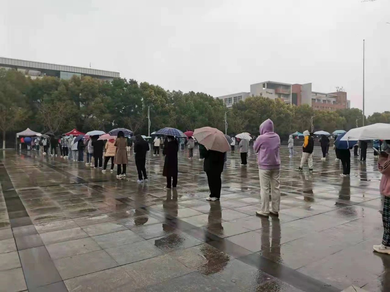 细雨蒙蒙中,教师志愿者们一直坚守现场,热情满满。你会时不时地听到“同学,请先扫一下场所码”,“同学,请提前准备好身份证”,“同学,请说下你的姓名和身份证后四位”,“同学,请拿好你们这些人的试管,并把它交给医护人员”……一句句的叮嘱清晰有力,也让雨中的现场检测工作更加顺利。这些教师志愿者大多是共产党员,当问到他们累不累,需不需要休息一下时,他们说:“这些不算什么,党员干部就要关键时候站的出来,冲到前面,也一定坚持到最后!”