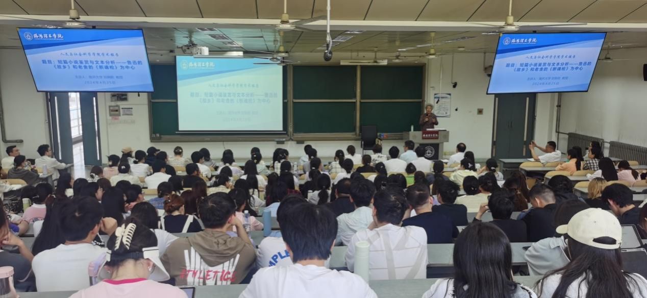 4月25日下午,南开大学刘俐俐教授应邀到王城校区教学楼AE101为我院师生做题为《短篇小说鉴赏与文本分析——鲁迅的〈故乡〉和老舍的〈断魂枪〉为中心》的学术讲座。讲座由我院院长扈耕田教授主持。副院长张瑞玲、张丽娜、中文系主任赵棚鸽、部分教师及汉语言文学专业200余名同学到场聆听。