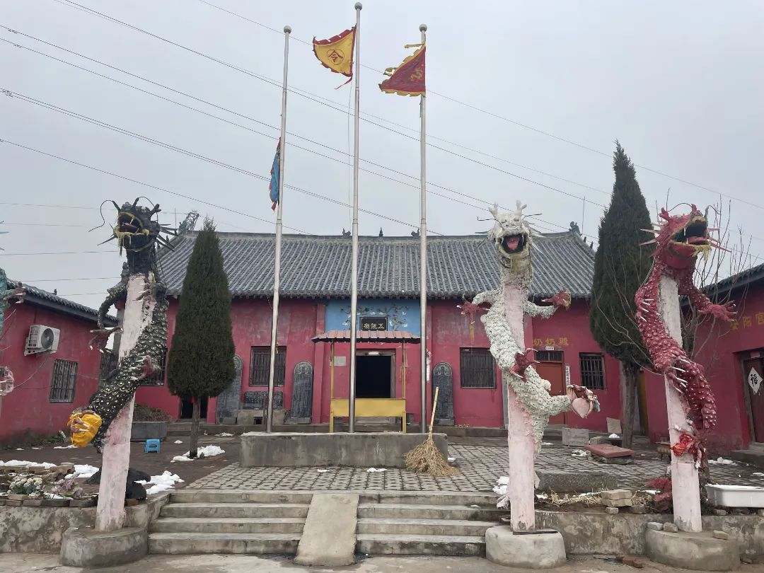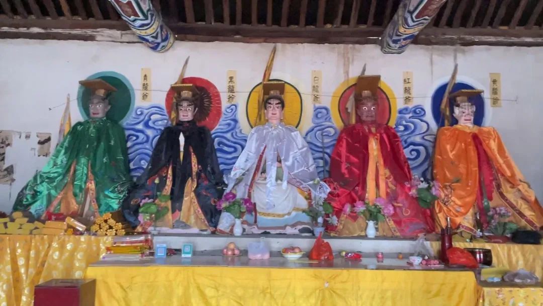 赵奶奶还向调研团队讲到,五龙庙外柱子上盘旋有绿、黑、白、红、黄五种颜色的龙,分别对应正殿五个神。而旗杆上的三面旗自东向西分别是红、黄、蓝三种颜色,红旗代表毛泽东,象征着旭日东升;黄旗是五龙令旗,可以召唤五龙的神秘力量;蓝旗代表祈雨。庙中大殿分为五龙殿、奶奶殿、观音殿、安阳宫。