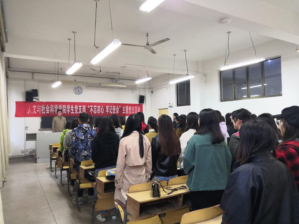为丰富党日活动形式,进一步激发学生党员的学习热情,人文与社会科学学院于2019年10月17日在开元校区A111教室举行“不忘初心、牢记使命”主题党日活动。参加本次活动的有人文与社会科学学院学生支部书记、全体学生党员。